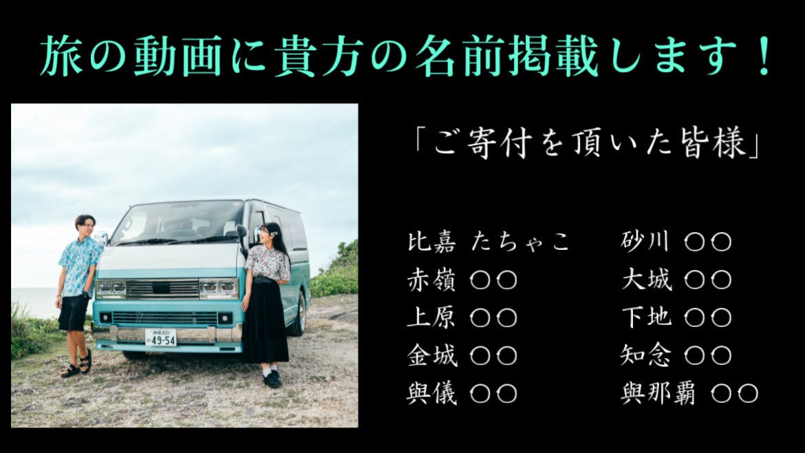 ・旅の途中で制作する動画にあなたのお名前を掲載させていただきます。動画のエンドクレジットに特別な感謝の気持ちを込めて、お名前を載せます。