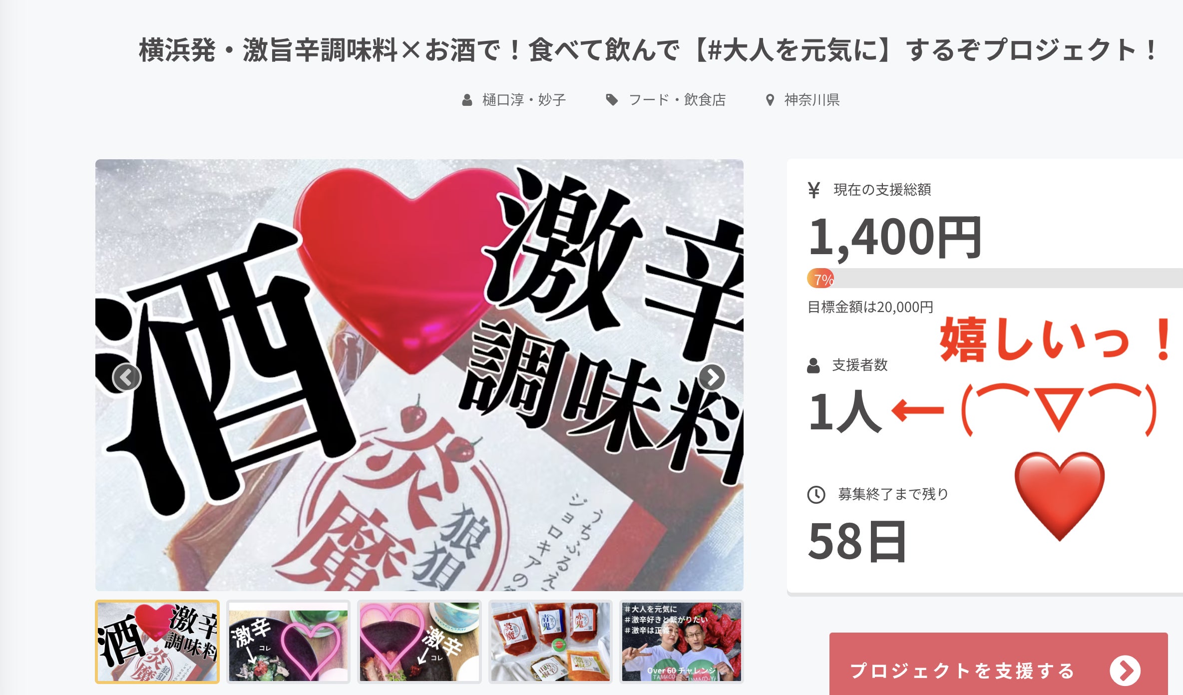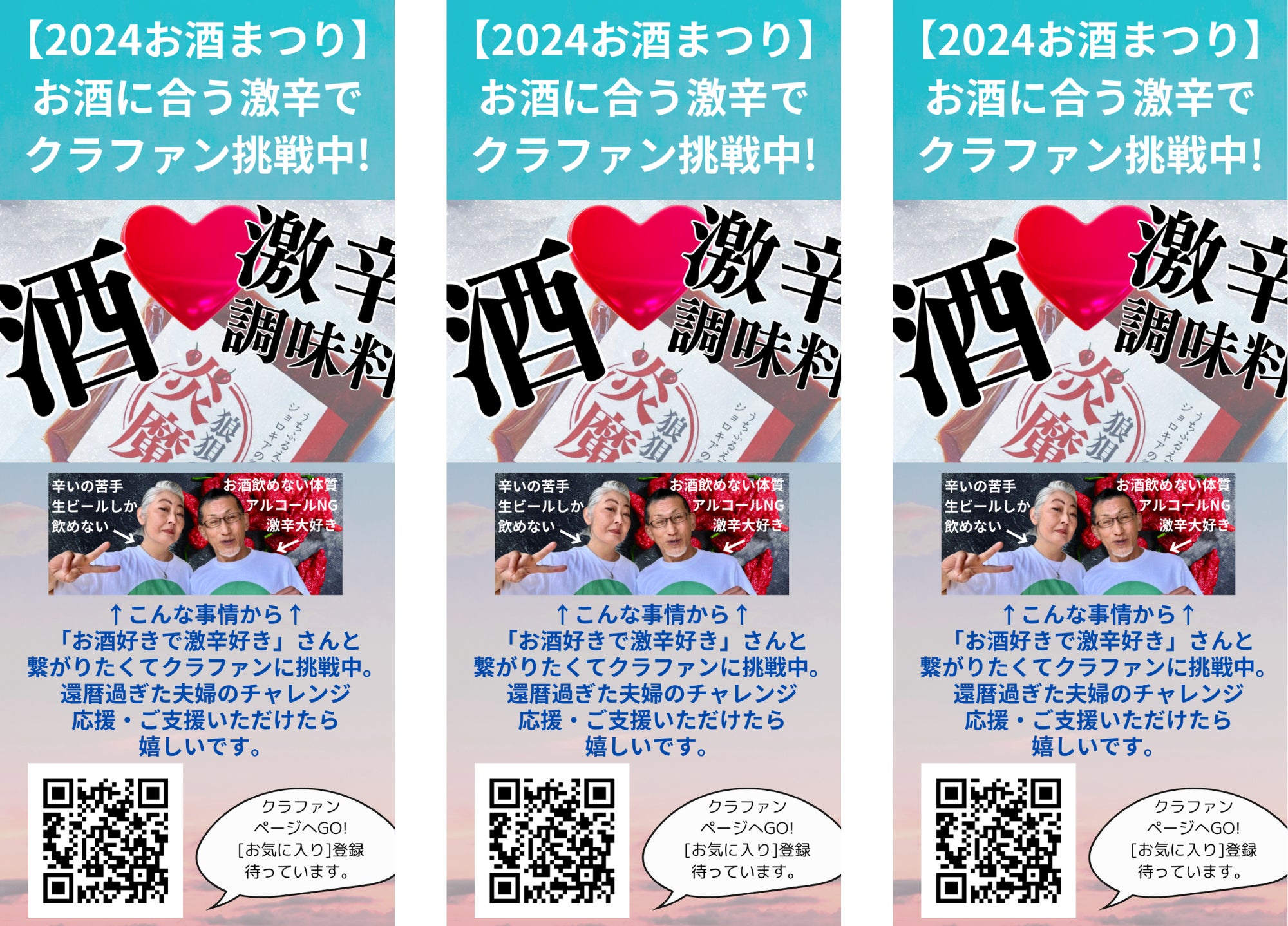 お久しぶりです、こんにちは。酷暑のみぎり皆様、いかがお過ごしでしょうか。6月のクラファンを無事達成し、7月の頭から返礼品を無事に発送し終えて、今週の水曜日には浅草の試食BARに3回目の納品に伺い・・・お陰様でTAMACO-YAは元気に稼働中です。日曜日には亀戸の赤からし市に初参加します。諸事情から商品は販売できず、告知やら認知拡大やらに全振りして力一杯、楽しんできます。と、前置きが長くなりましたが、『8月1日からまたクラファンやってます』「冷やし中華はじめました」じゃないんだから、何、シレッと言ってるのか?と、言われそうですが・・・やってます。分かっているんです。すんごい不利なの。だって今回の初回クラファンでご支援頂いた方々のお家の冷蔵庫の中にはまだウチの子達がいるんだもん。そうなんです、激辛調味料の課題の1つが・・・「冷蔵庫にやたらと長居する」=消費されづらいデス。確かにね、普通の一般家庭だとタバスコや七味唐辛子が「何年前野ですか?」ってくらい長持ちしてるもんね。けどね、それを承知で何故、初回クラファンが終了して2ヶ月もしないうちにまた新しいクラファンに挑戦したの?と、問われたら・・・答えは「自分たちの足りないものを補える人との出会いを求めて!」あちこちに書きまくってますが、主人は「激辛大好き」だけど「アルコールが体質的にNG」私は「激辛は作れるけど食べるの苦手」「お酒は喉ごしだけで生ビール一択」信念じゃないけど、『#大人を元気に』を掲げてるでしょ。これは腹の底から思っています。で、「激辛もお酒も」大人がたしなむもの。う〜〜〜〜ん!!激辛好きでお酒好きの人と超絶出会いたい!!と、想いが炸裂して、クラファン第二弾に頭からダイブした次第です。正直に言えば「どーか、力を貸してください!」とあなたの耳元で叫びたい。前回のクラファンだってSNSとかまだ不慣れで、ほんと、リアルの方々から端からお声がけ状態だったしね。でも、還暦夫婦のおバカなチャレンジ。パリで若い人たちも頑張っているし、だったらついでに応援しちゃおうかな?と、思って欲しいです。良かったら、再びご支援ください。もしくは「お気に入り」ボタンをポチッとしてください。まだまだ暑い日が続きますが、熱中症など諸々お気をつけて健やかにお過ごしください。(野菜に青鬼とか赤鬼つけて食べると体温下げる効果もありそうです)2024お酒まつりのクラファンページ
