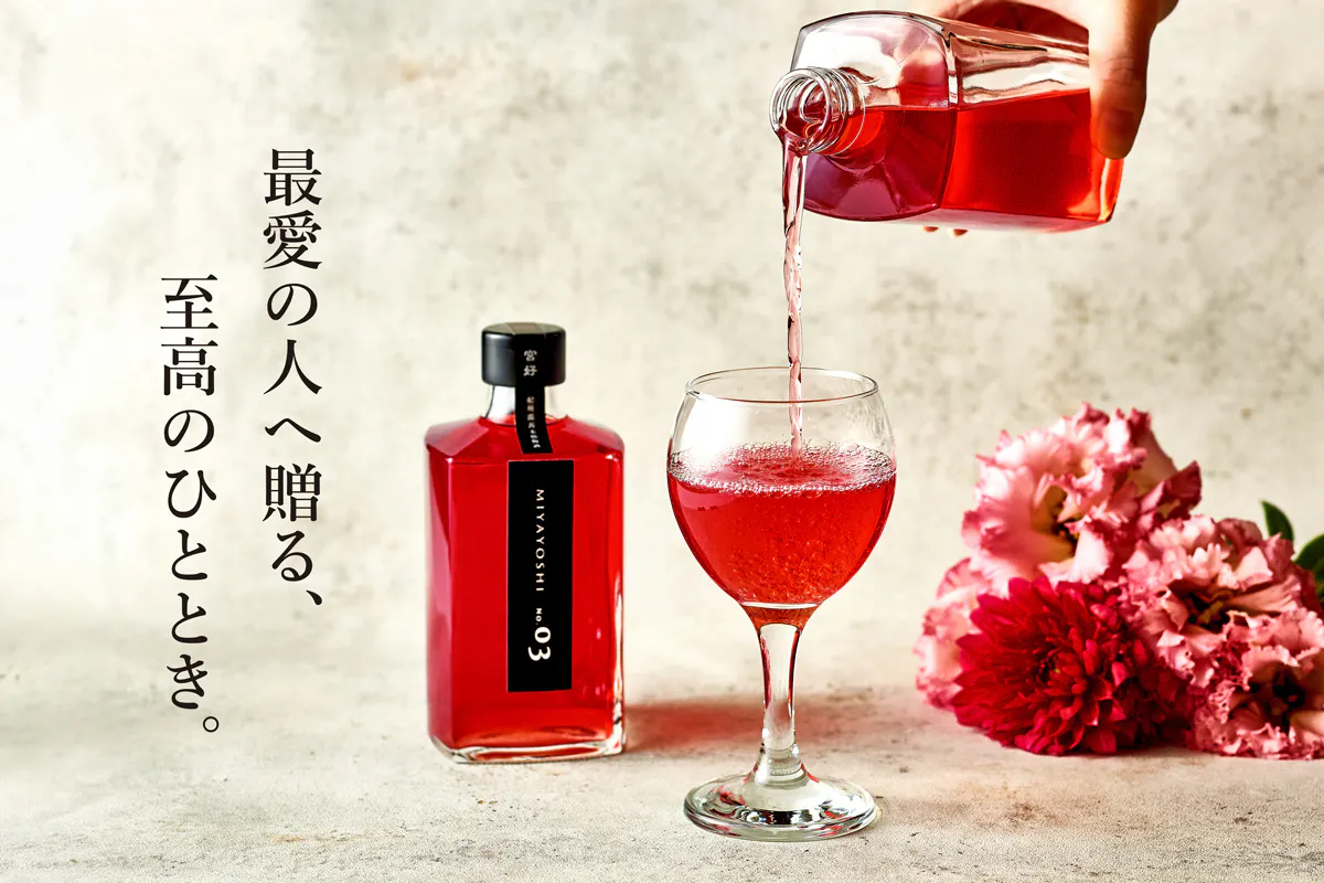 ”つゆあかね”果実を独自の製法で漬け込んだ「MIYAYOSHI」は、果実のフレーバーをとてもしっかり感じ取れる甘いワインのような味わいです。そのままロックで召し上がっていただくのが一番果実を感じていただけますが、その濃厚な味は、ソフトドリンクと割ったり、ほかのお酒のフレーバーとして少量混ぜるなど様々な味わい方を堪能していただけます。