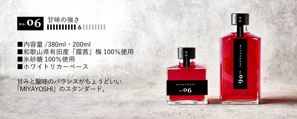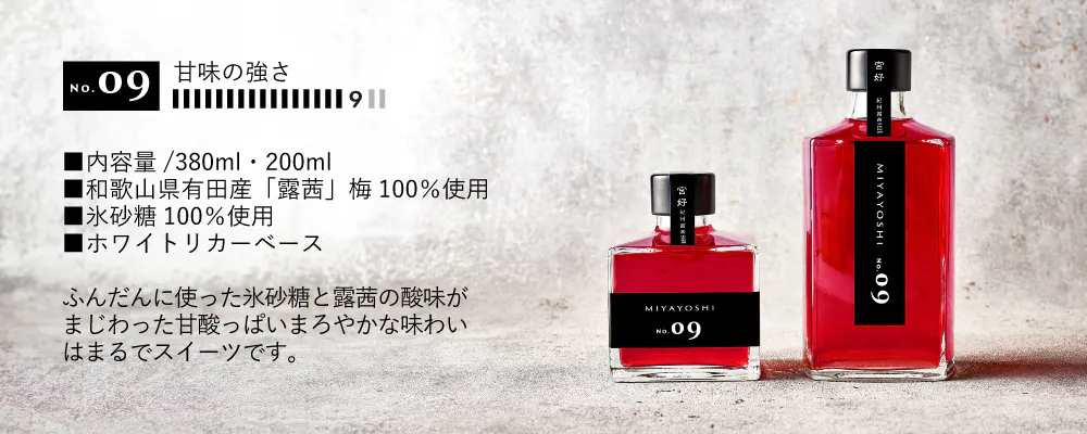 和歌山有田市の自社農園で育てた、果実まで赤い梅の希少種「つゆあかね」を蒸留酒と同量だけ贅沢に使い、氷砂糖と漬け込んだこだわりのプラムリキュール「MIYAYOSHI」は、着色料など何も使わない天然由来の透き通った鮮やかな紅色、甘酸っぱいさわやかな香り、濃厚な味わいの中にも後味をすっきりさせる独自の酸味が特徴です。