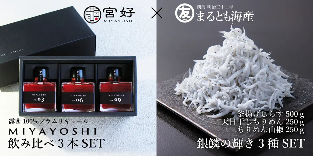 和歌山県湯浅町にて明治32年に「宮賢」の屋号としてしらす屋を創業し、以来100年間天日干しのちりめんを作り続けてきた老舗「まるとも海産」。紀伊山脈から流れ出す植物性プランクトンと海の海洋性プランクトンがまじりあう栄養豊かな紀州湯浅湾でとれたシラスを昔ながらの製法で作る、風味豊かな釜揚げしらす・天日干しちりめんなどは絶品です。TVなど多数メディアにも取り上げられた「まるとも海産」の絶品しらすが「MIYAYOSHI」プラムリキュールとコラボしました。和歌山有田地方の海の恵み・山の恵みを丸ごとお楽しみください。