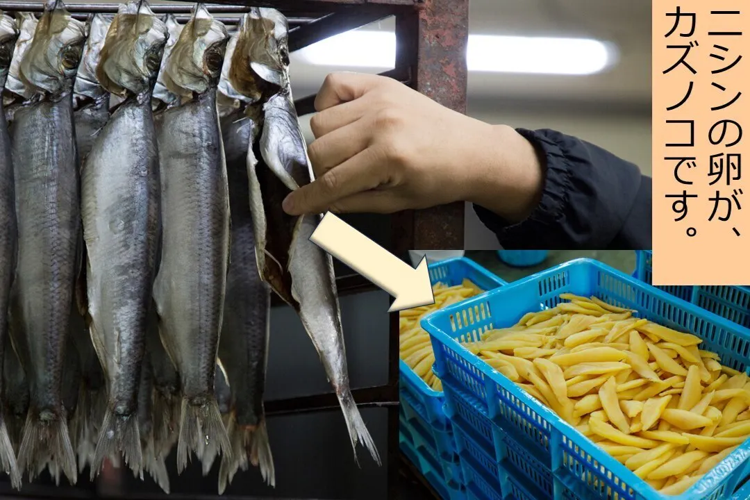 北海道を代表する魚、サケ(鮭)もたくさん獲れます。川を遡上する前に海で生け捕りにし、新鮮なうちにメスのお腹からとり出した筋子(すじこ)は加工場で丁寧にほぐされて、キラキラのイクラとなります。