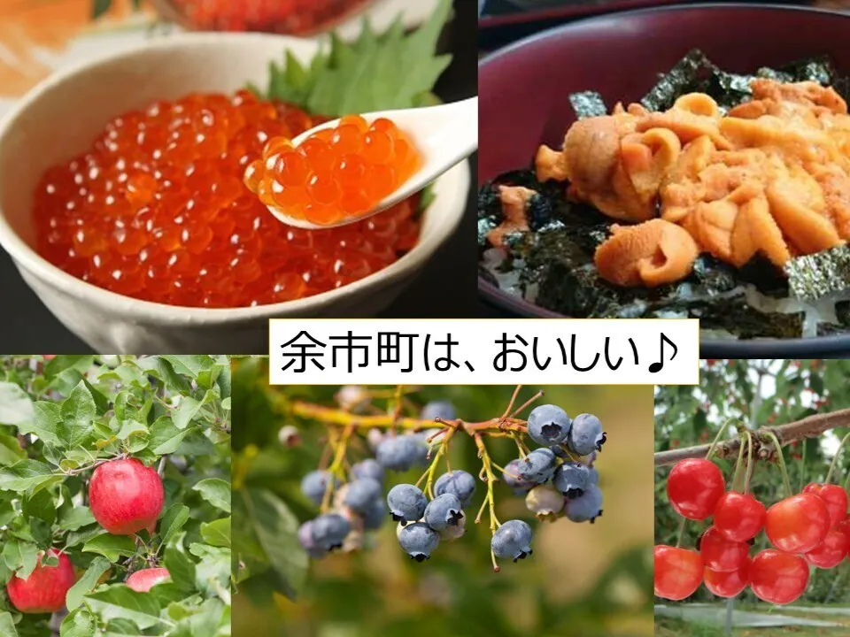 余市町は、北海道にしては比較的温暖な気候のため、道内一の生産量を誇るリンゴやブドウ、ナシ、モモのほかにも、イチゴ、サクランボ、プルーン、ブルーベリー、クリなど数多くの果物が手に入ります。