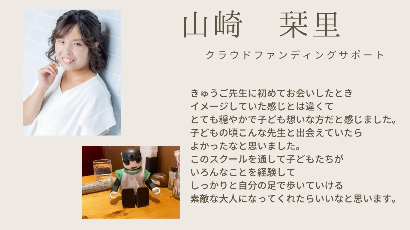 こんな時代だからこそ、先生とは違う立場で、未来を生きる子どもたちの可能性を育てていくことが出来る教育の環境を提供すること、ひとりひとりの個性を尊重することの出来る居場所づくりに力を入れていきたいと思います。