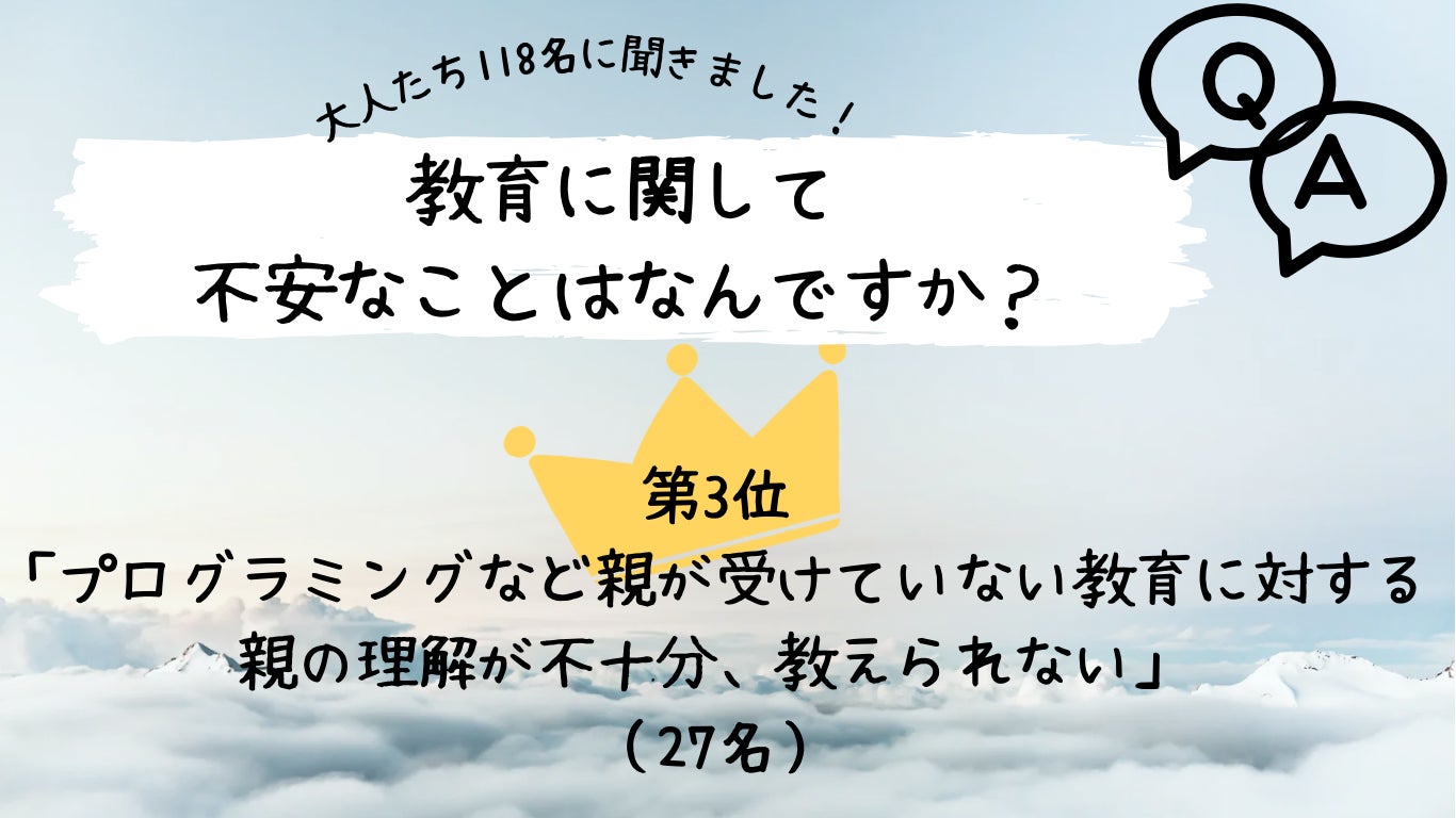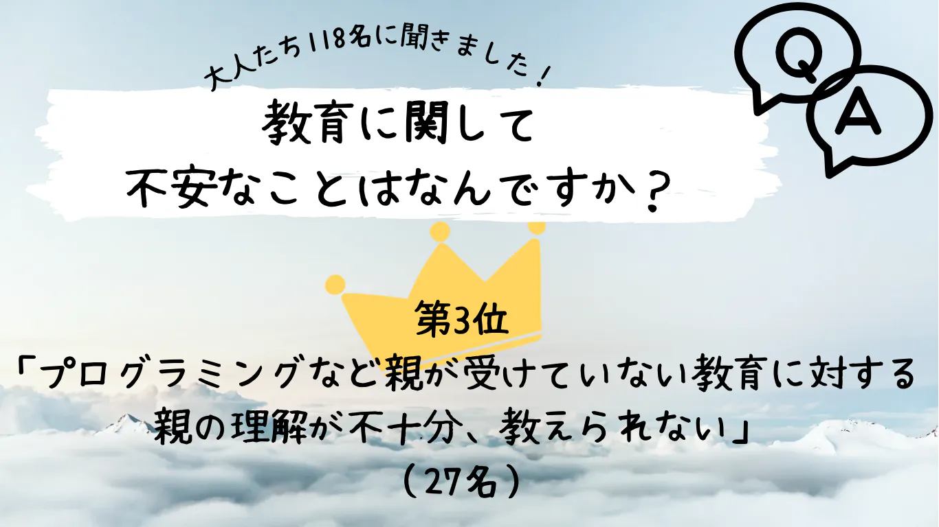 3位 『プログラミングなど親が受けていない教育に対する親の理解が不十分、教えられない』(27名)