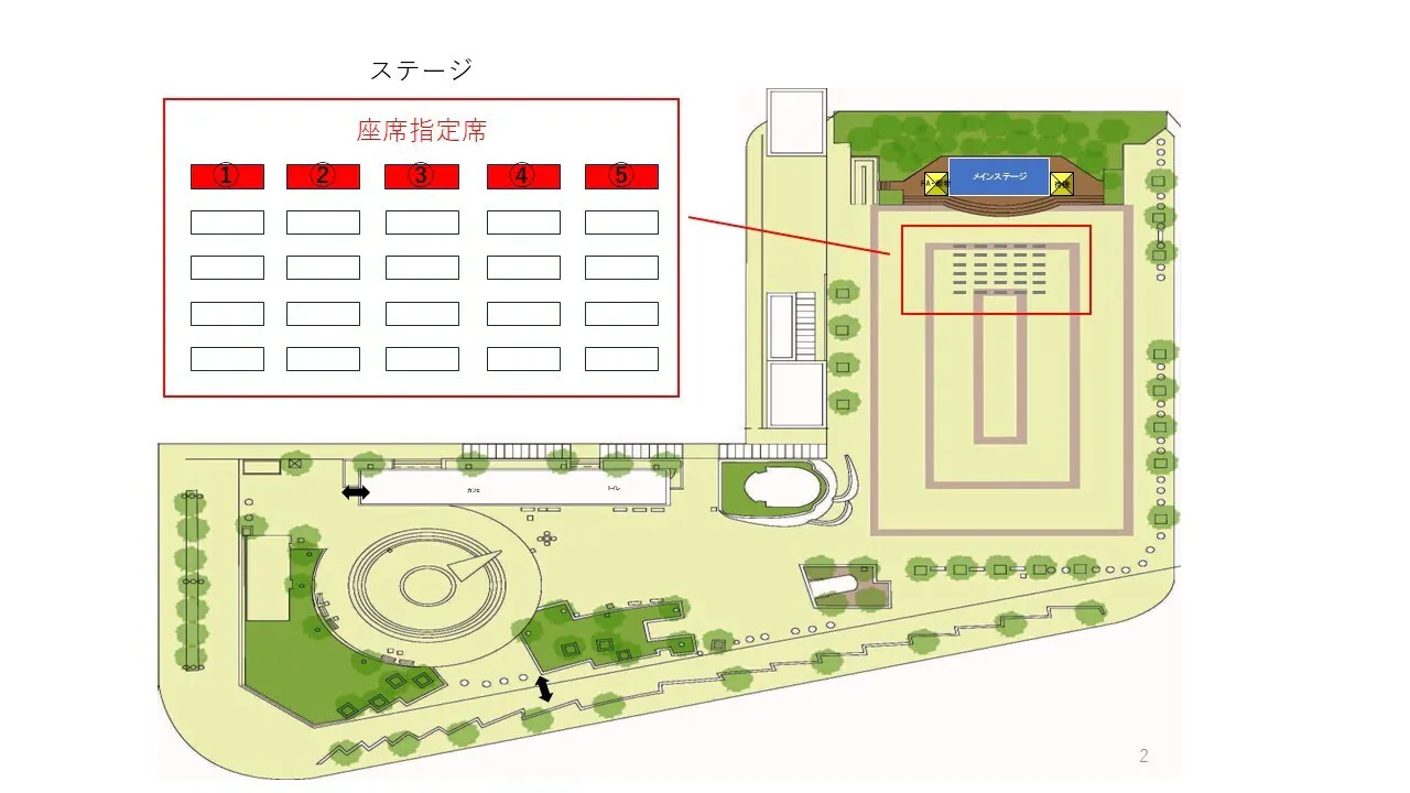 予約できる座席は会場図にてご確認ください。座席は2~3人掛けアルミベンチとなっております。