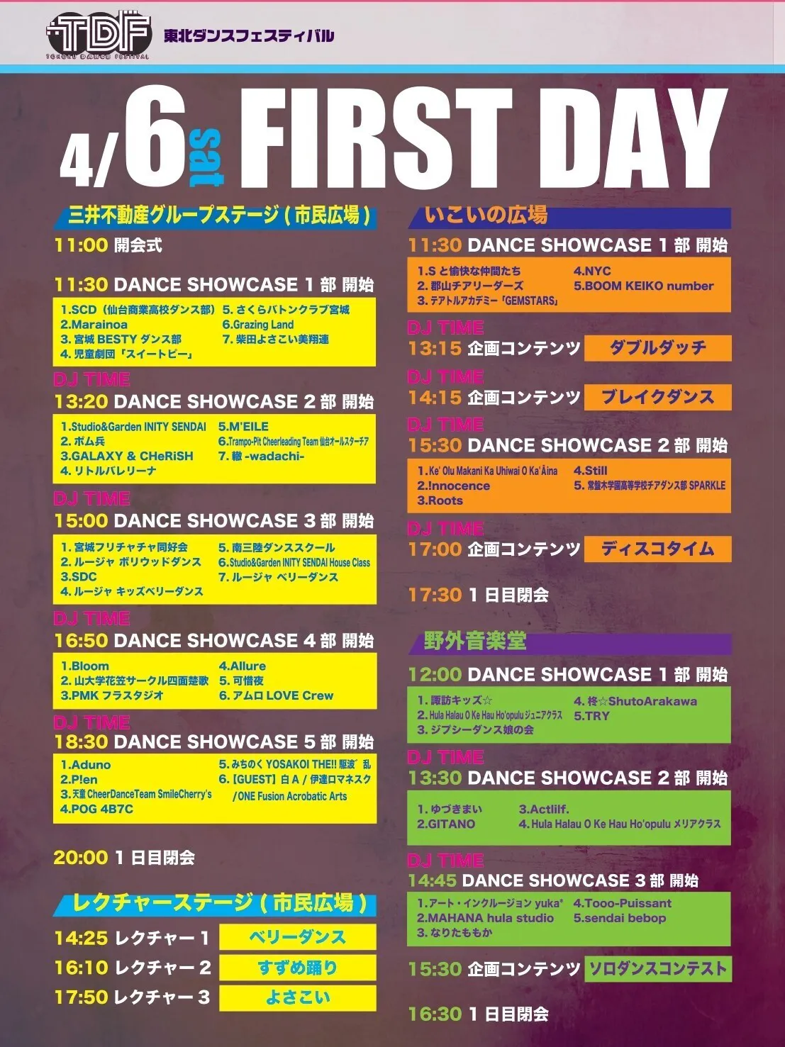 第3回となる今回は、会場を勾当台公園市民広場、いこいの広場、野外音楽堂の3箇所に拡大し、第2回からさらにスケールアップしたイベントとなります。出演者は総勢120団体、約1200名を予定、伝統舞踊(花笠踊りや阿波踊りなど)、YOSAKOI、ストリートダンス、J-POP ダンス、チアダンス、社交ダンスなど、幅広いジャンルの踊りが披露されます!!