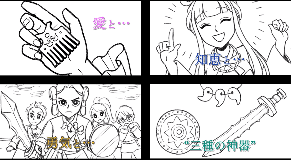 ヤマトタケルが家来を率い人々を苦しめる魔物退治に出発する現場にワープしていたのです。3人が手にしていた3本の羽根は、いつしか三種の神器(草薙剣・八咫鏡・勾玉)に姿を変え3人の手に収まっていました。何が何だかわからないまま、三種の神器を携えヤマトタケルのお供となって旅をすることを命ぜられました。