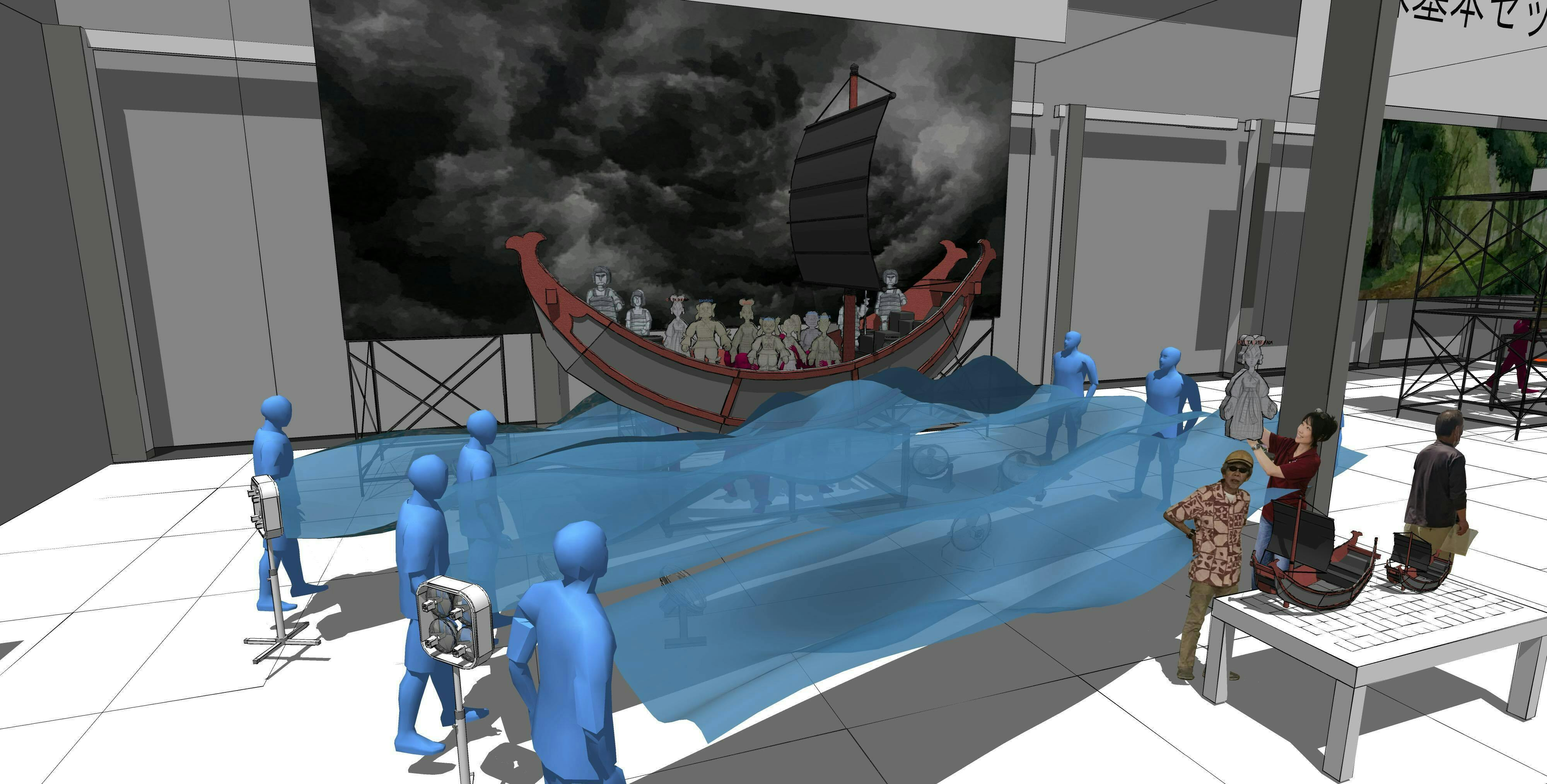 海の波は、以下のように人の手で作ります。支援者の方と一緒に映画のシーンをひとつずつ作っていきたいです。