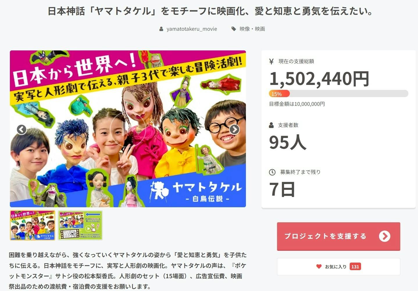 現在131名の方にお気に入り登録をして頂き、95名のご支援で150万2,440円集まり、目標15%を達成しております!!