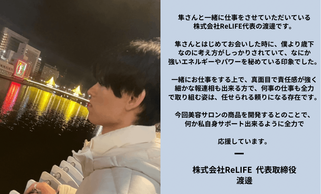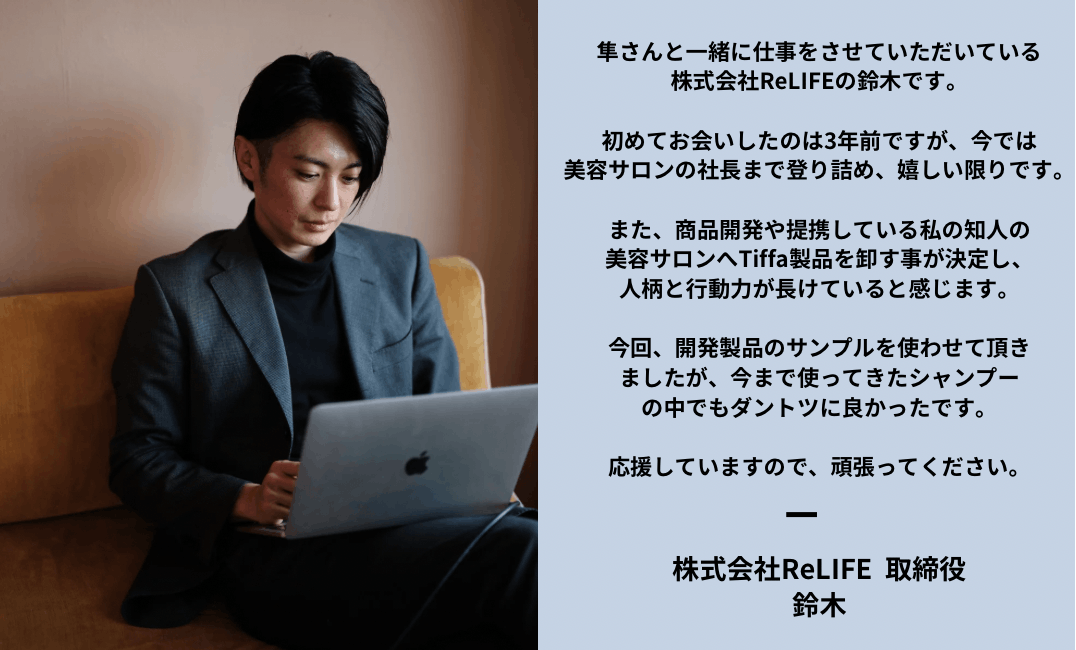 青森県青森市出身。株式会社Tiffa代表、株式会社ReLIFEの専務として活動しており、現在は経営活動、SNS支援、コンサル支援、自社商品の開発に注力しております。