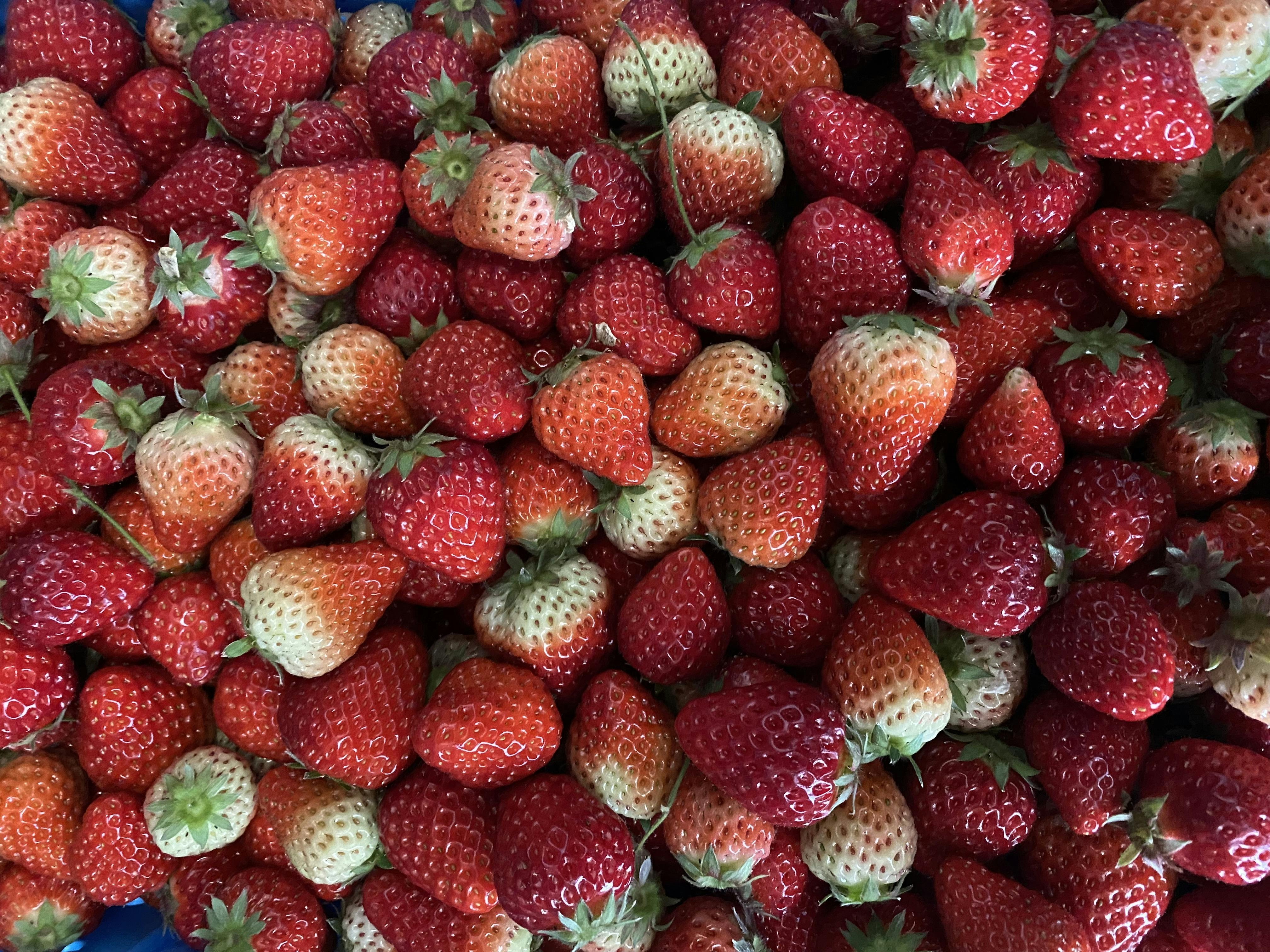 いちごの甘味は取った瞬間から糖度が決まっています、左のいちごの様にスーパーなどで販売されているいちごはヘタは白く早摘みのいちごになっております!右側の完熟したいちごは規格外品として扱われ出荷出来ずほとんどが廃棄処分となってしまいます。そこで業務用急速冷凍庫で冷凍し、いちご本来の味を全国に提供したいと思っています!食品ロスを減らす取り組みを通じて、地域社会の活性化と食品サイクルの構築を目指します!