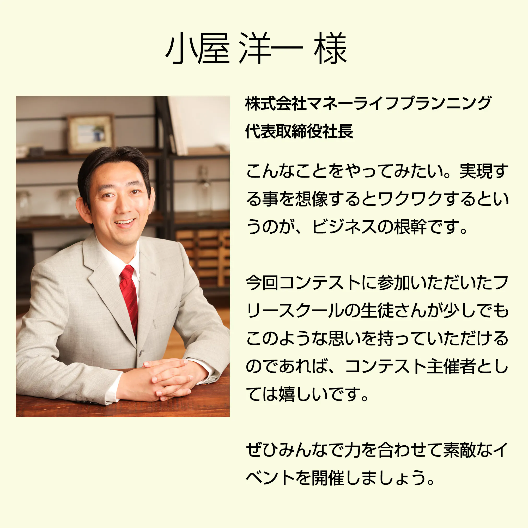 コンテストで拝見した資料はカラフルで一瞬で目を惹くものでした。内容を拝見すると、立案の理由も、費用の計算も、実現したあとのお金で、何がしたいかもしっかり記載されている素晴らしい内容でした。今回のチャレンジが、更なる子どもたちの一歩を踏み出すきっかけになることを願っています。