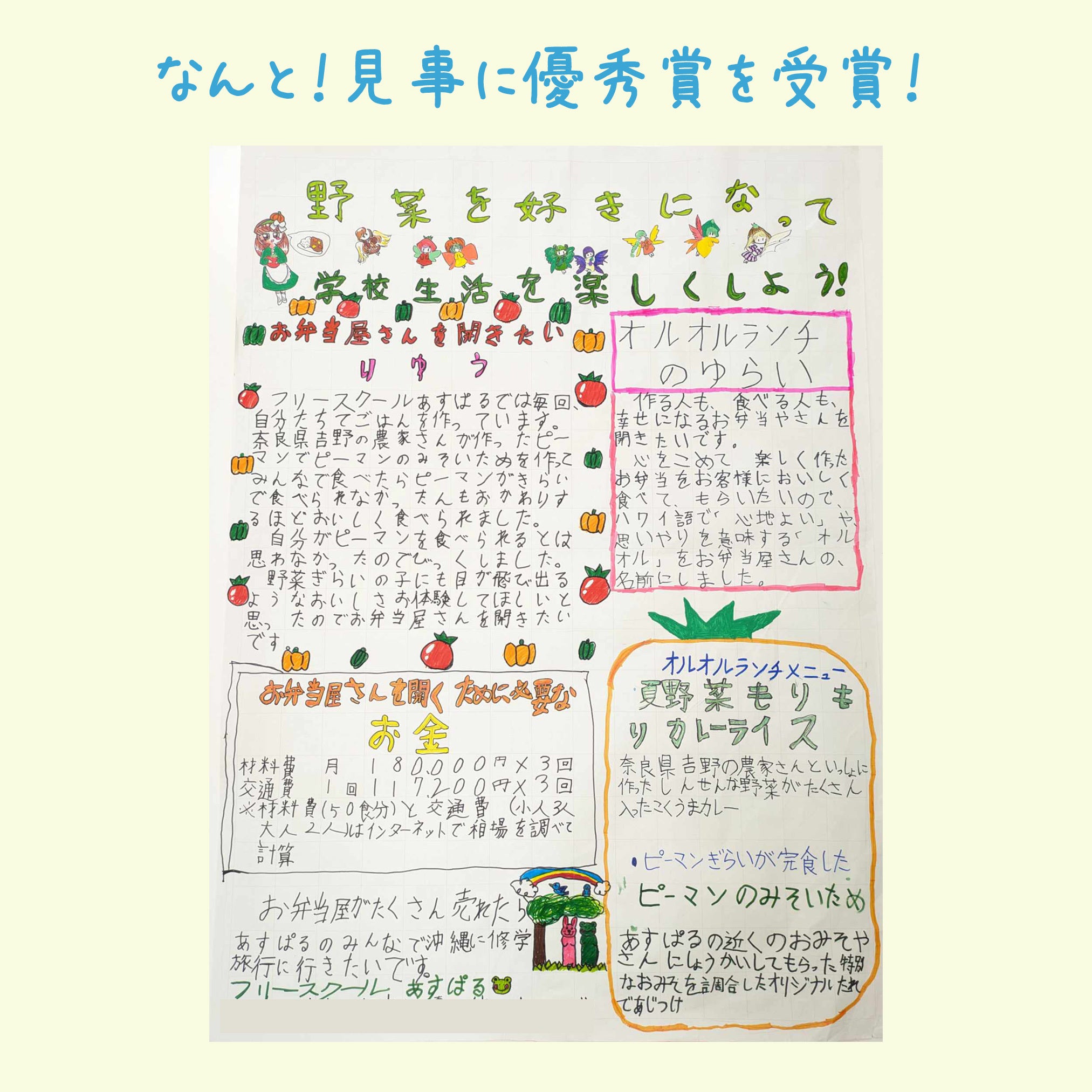 自由研究で、子ども達が一生懸命考えた企画は、「野菜を好きになって学校生活を楽しくしよう!100万円でお弁当屋さんを開きたい!」
