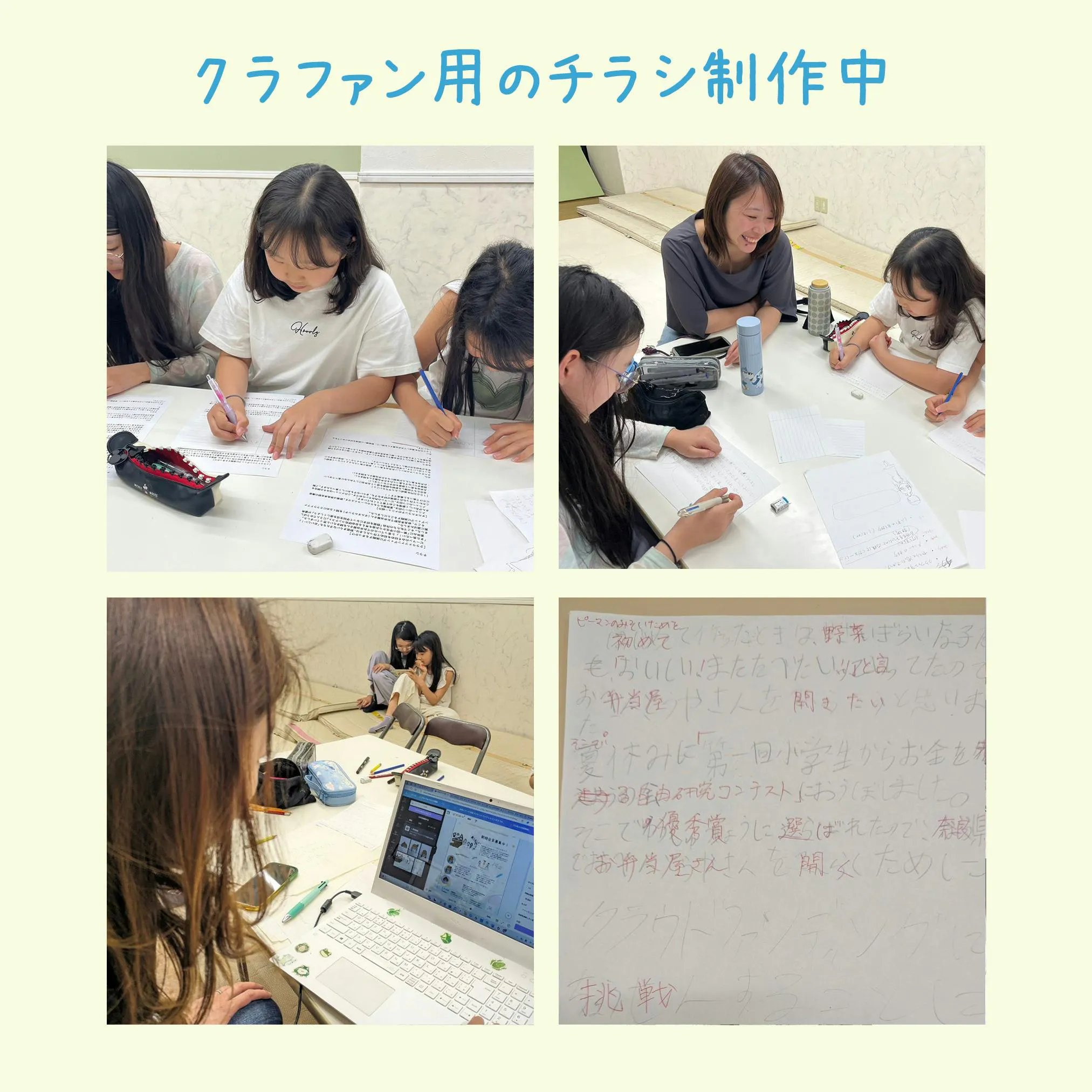 女の子たちのお弁当屋さんを開きたいという願いとその目標に向かって頑張る姿が、一緒に過ごしてきた男の子たちにも大きな影響を与えて、これまで慎重でなかなか動こうとしなかった男の子たちの心を動かし、あすぱるのみんなで吉野でお弁当屋さんを開きたい!という大きな目標に変わりました。子ども達の夢がまた大きく進化したことを一人でも多くの方に知っていただきたいです。引き続き、応援のほどよろしくお願いします。