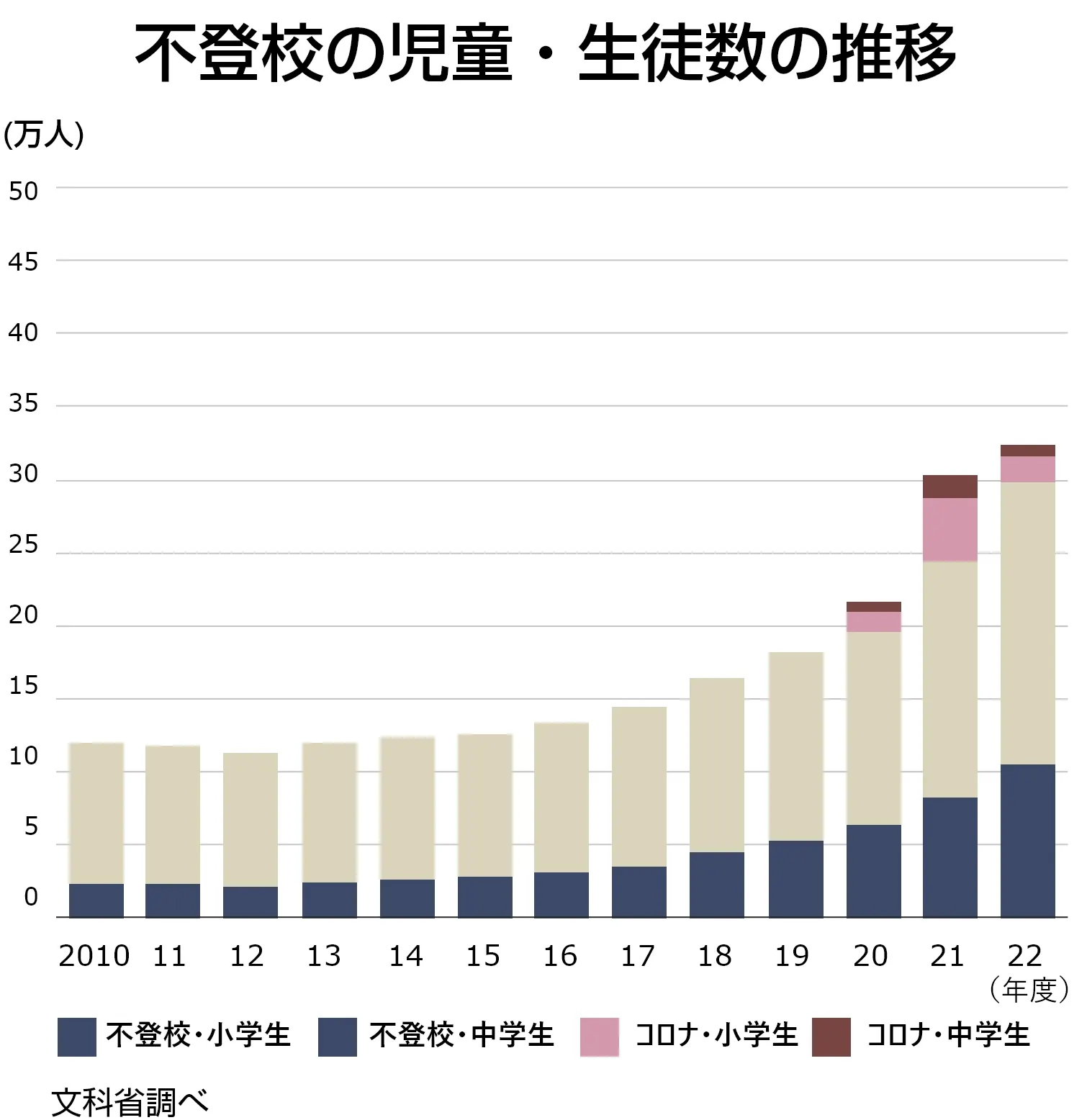 文部科学省が令和5年10月に公表した調査によると、全国の小中学校で2022年度に学校を30日以上欠席した児童、生徒の数が前年度から5万4108人(22.1%)増の29万9048人となって過去最多を記録しました。