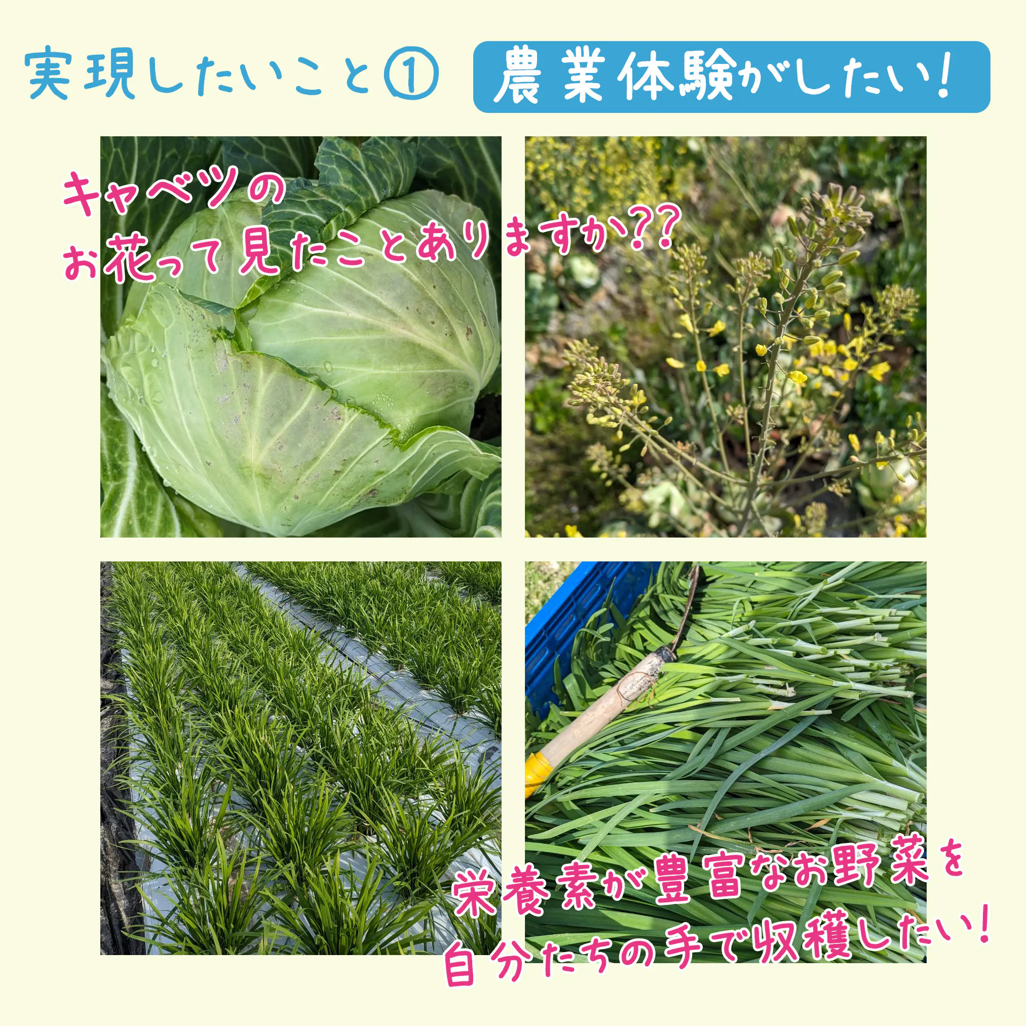 みゆう(小学6年生)「3人で仲良く協力してお弁当屋さんを開きたいです。これまで一緒にあすぱるで調理活動をしてきた男の子も一緒に奈良県吉野で農業体験をしたり遊んだりしたいです。」