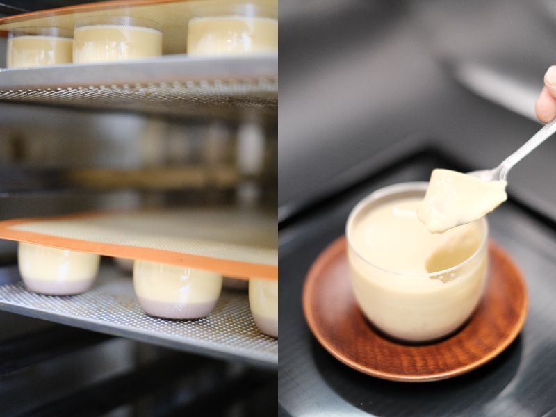 通常のオーブンとは違い加圧蒸気で焼き上げる事でムラなく仕上がり、プリンは驚くほどになめらかな食感に仕上がります。今回のプリン作成の為だけに導入したこのオーブンで最高のプリンを作り、皆様へお届けします。