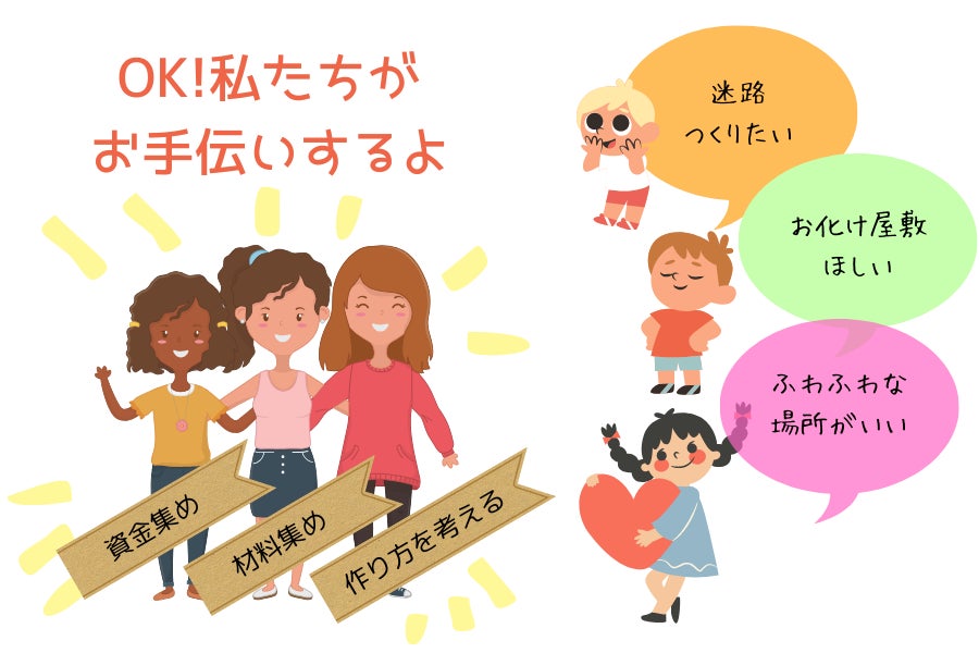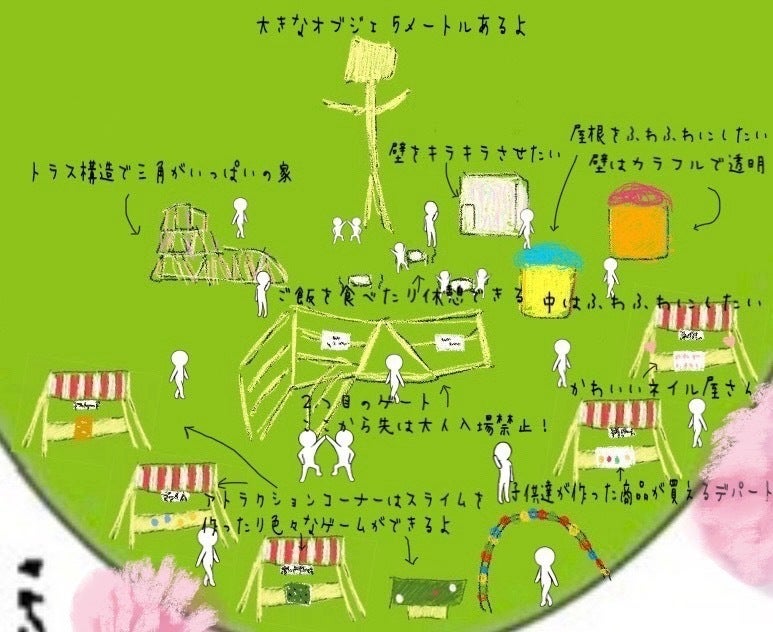 動画では子どもたちが考えを模型を使って説明している様子です。このように開催までの期間はミーティングなどを通して、子ども達の夢を叶えられるように思いや考えを引き出しています。