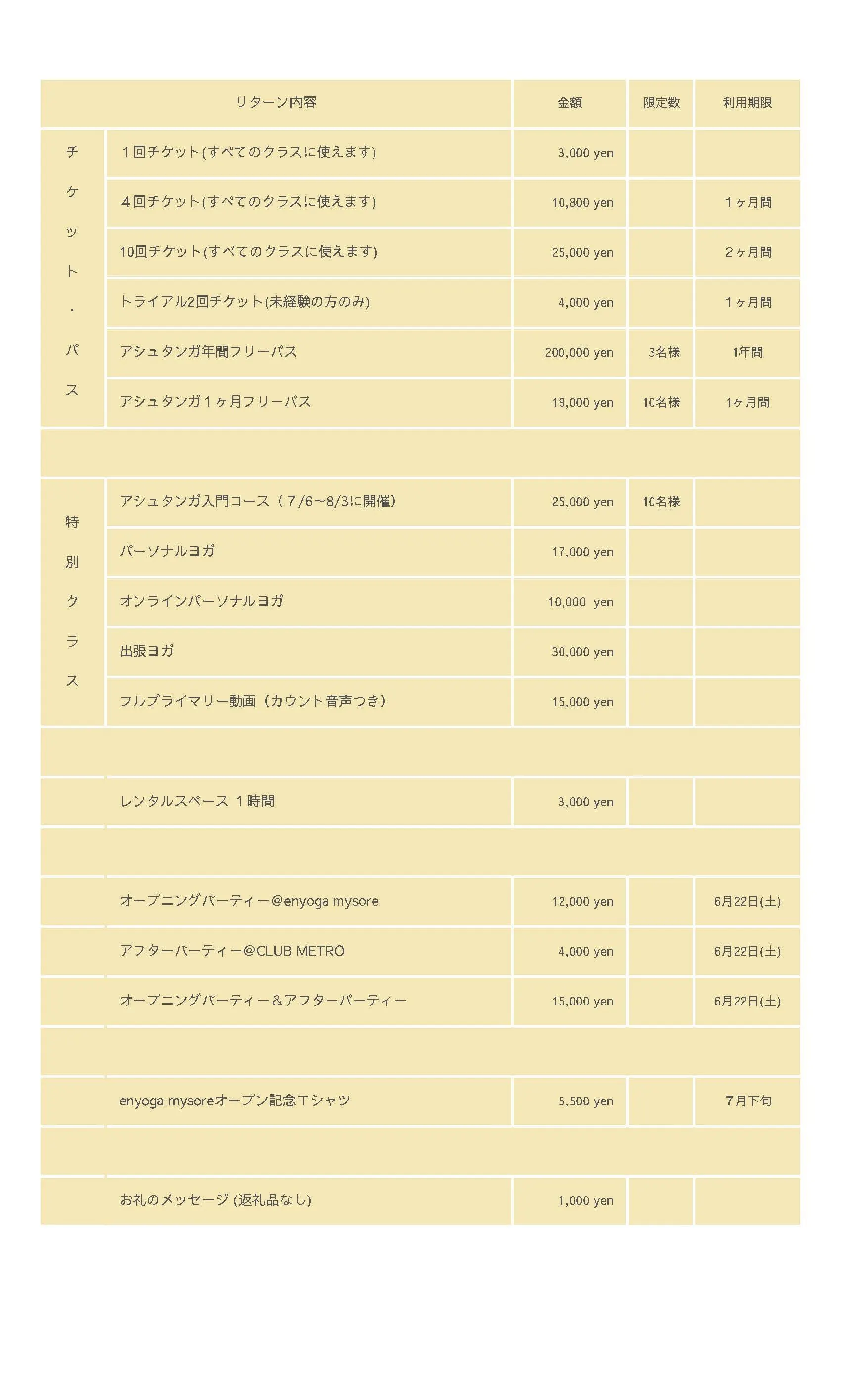 ご支援いただける方々には、お得なチケットやパス、特別クラスや限定グッズなど様々なリターンをご用意しております。