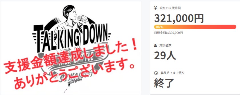昨年のクラウドディングでは、目標金額30万円に対して、32万1000円のご支援をいただき、お陰様で、営業トーク大会『トーキングダウン1』を開催することが出来ました。ご支援・応援していただき、誠にありがとうございました。