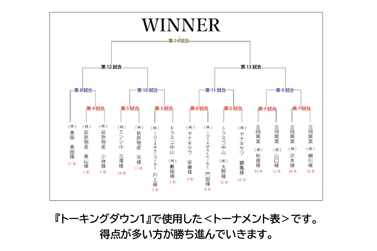 トーナメント制で全14試合行い、公平に審査を行う為に、<採点表>は営業トークをされるセールスが所属している会社以外の会社様に審査していただき、勝者を決定いたしました。