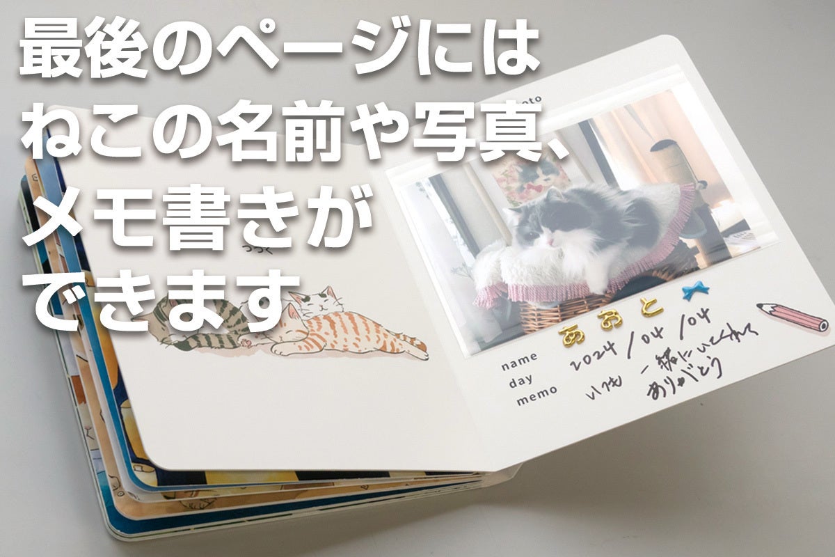 最後のページにはねこの名前・写真・メモ書きが出来るスペースも。ねこと楽しく過ごしたひと時を残せるようになっています。