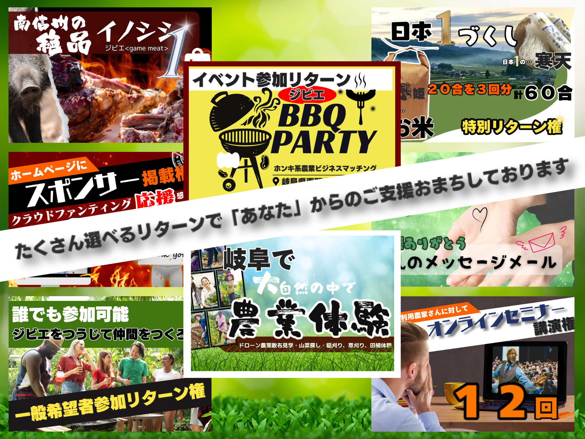 お礼のメッセージ、商品提供、お食事、農業体験など