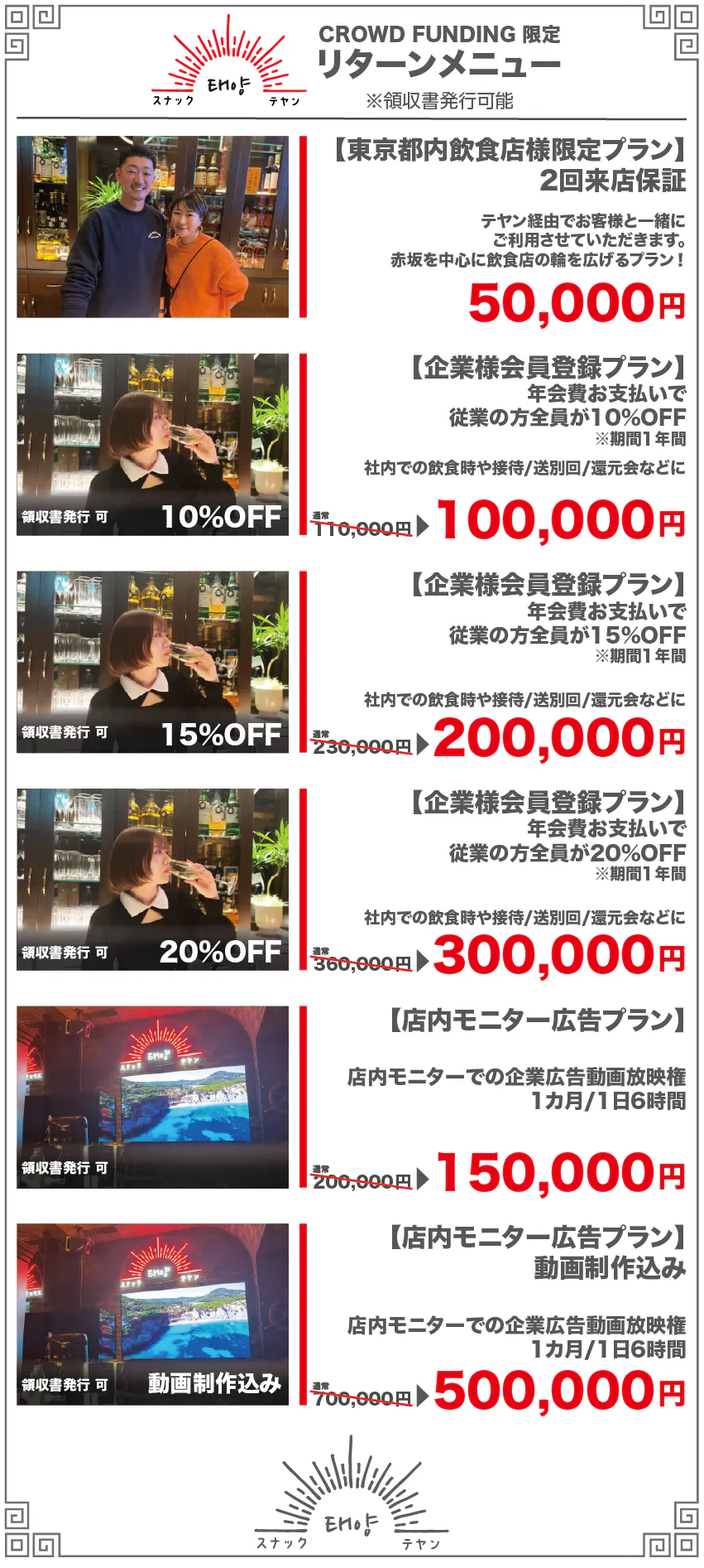 一般のリターンのみならず、法人様向けのリターンもご用意しております!