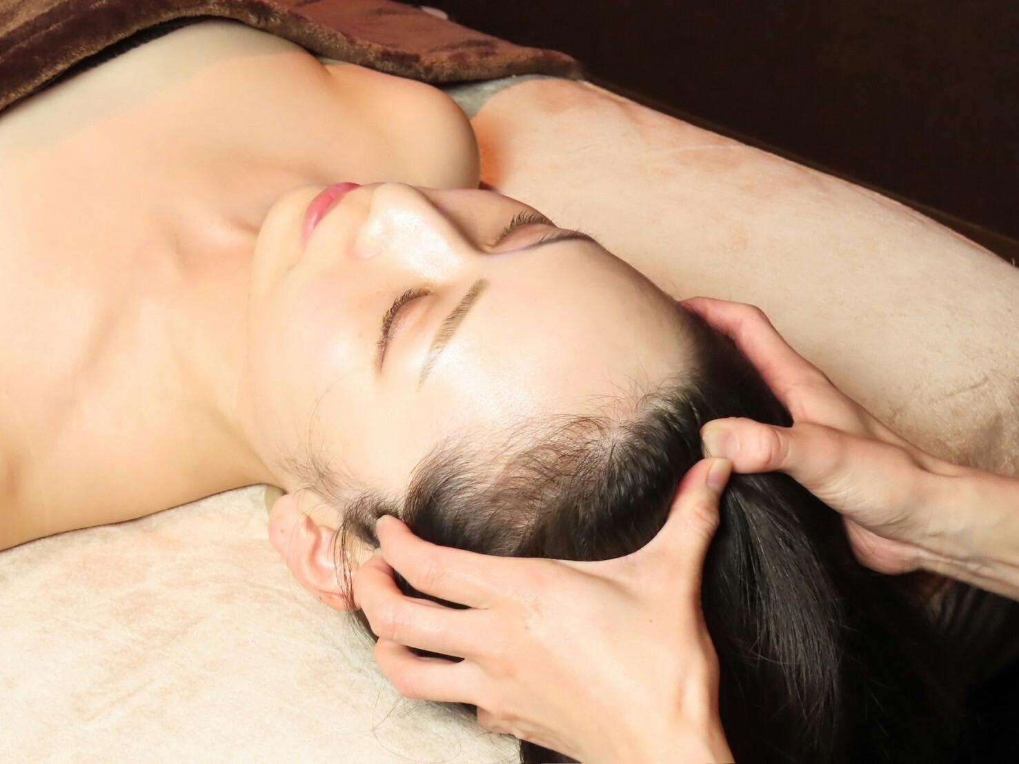 リラックス効果の高いアロマオイルでマッサージし疲労回復やストレス解消へ。また血行促進し頭の老廃物やむくみも取れて頭が小さくなります。首まで流すので眼精疲労やコリがつらい方にも◎