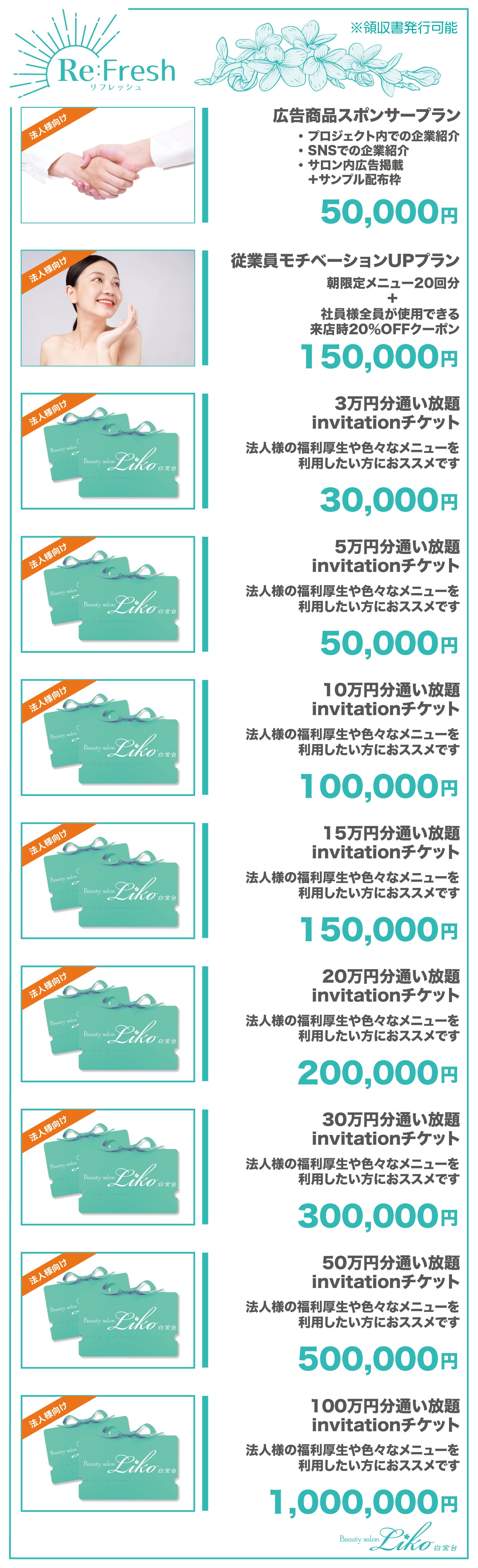 一般のお客様にはもちろん、より多くのお客様や忙しい女性にBeauty salon Likoの【Re:Fresh(リフレッシュ)】を通して、癒され、日々の活力充電の場として法人様にもご満足いただけるようなリターンを設定しました!