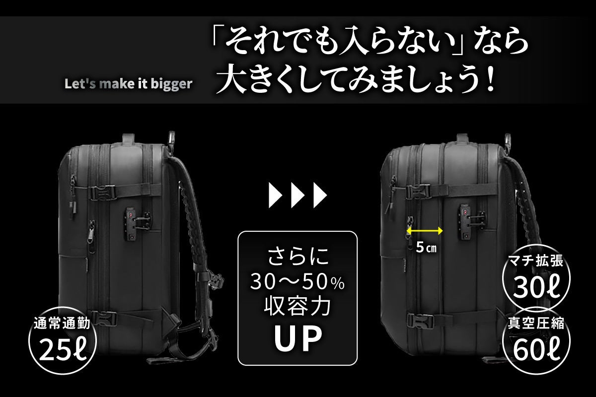 さらに、衣類を圧縮すれば最大60ℓまで対応です。大袈裟ではない正真正銘の大容量です。