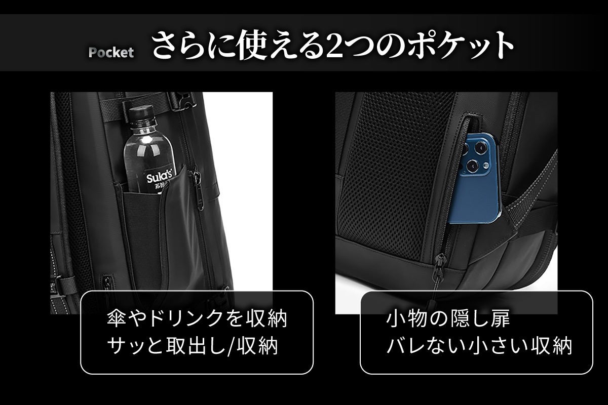 さらにすぐに取り出したい飲料のペットボトルや折り畳み傘などの収納可能なサイドポケット、