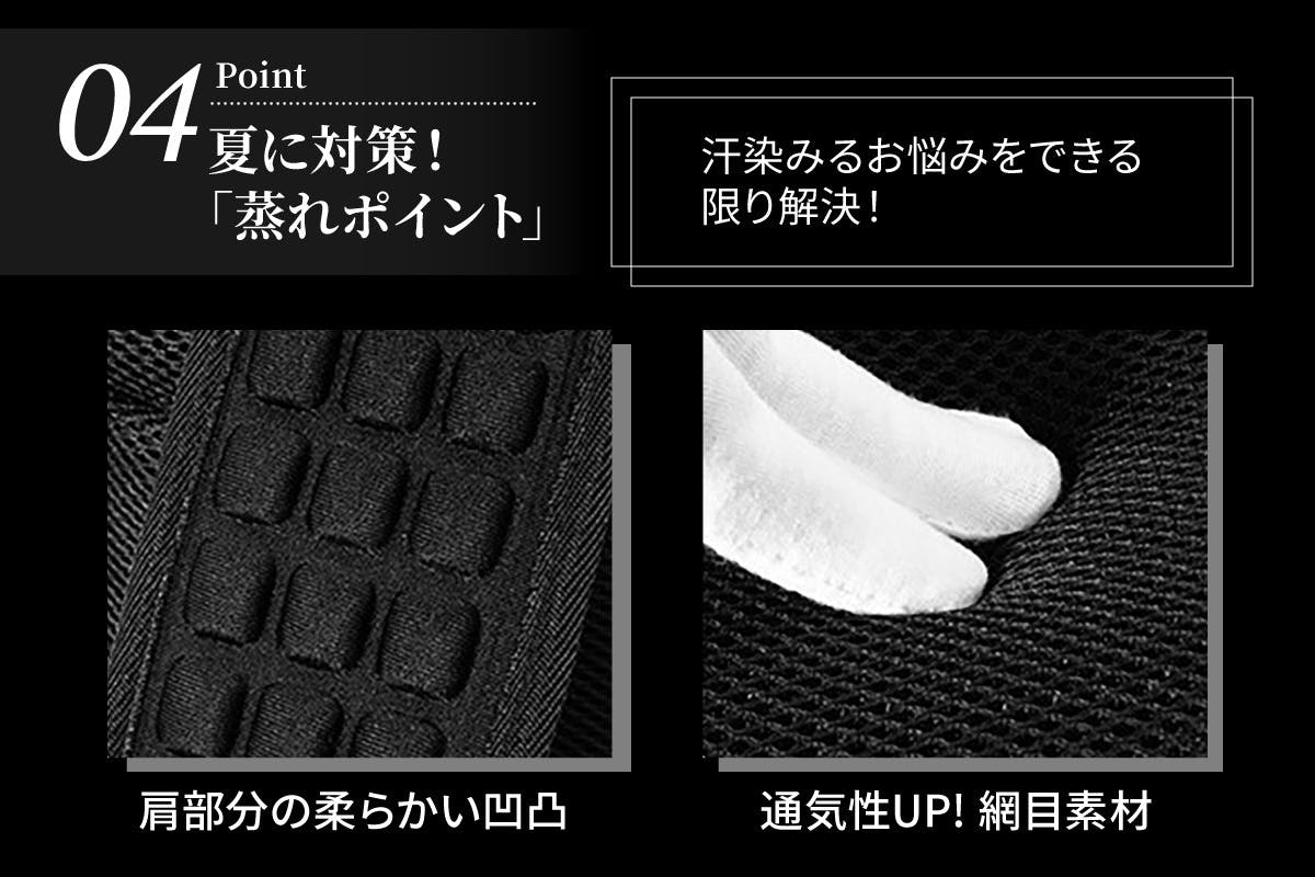 肩に掛かる荷重を均等に分散する凹凸は、長時間の着用でも肩が疲れにくくなります。