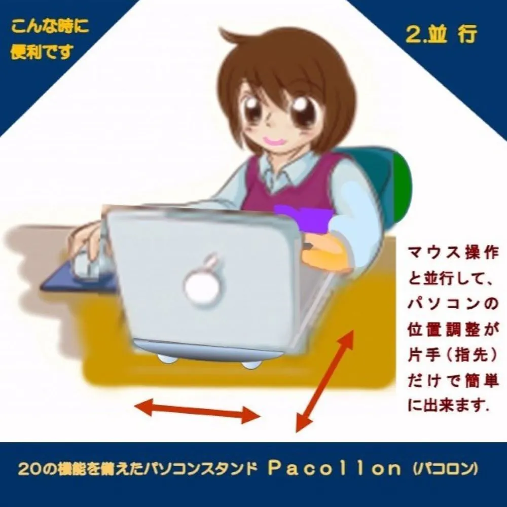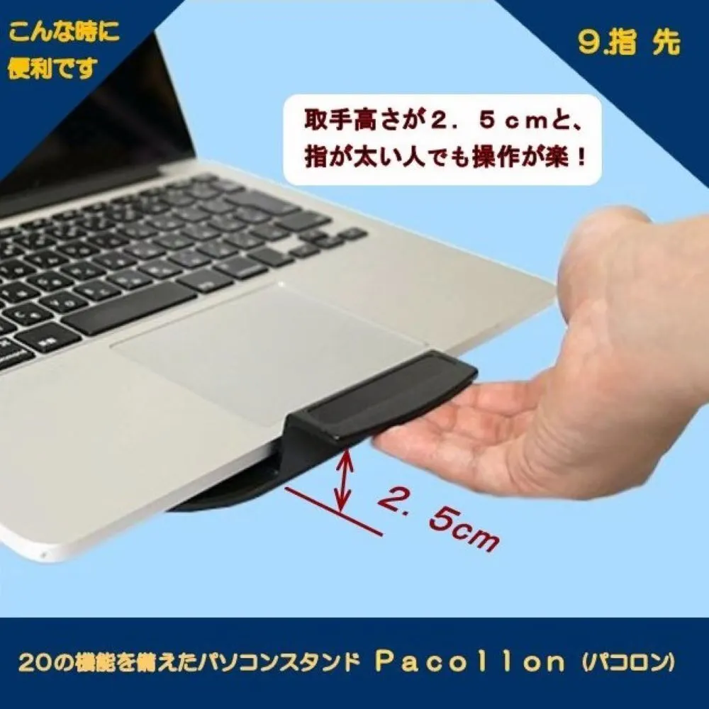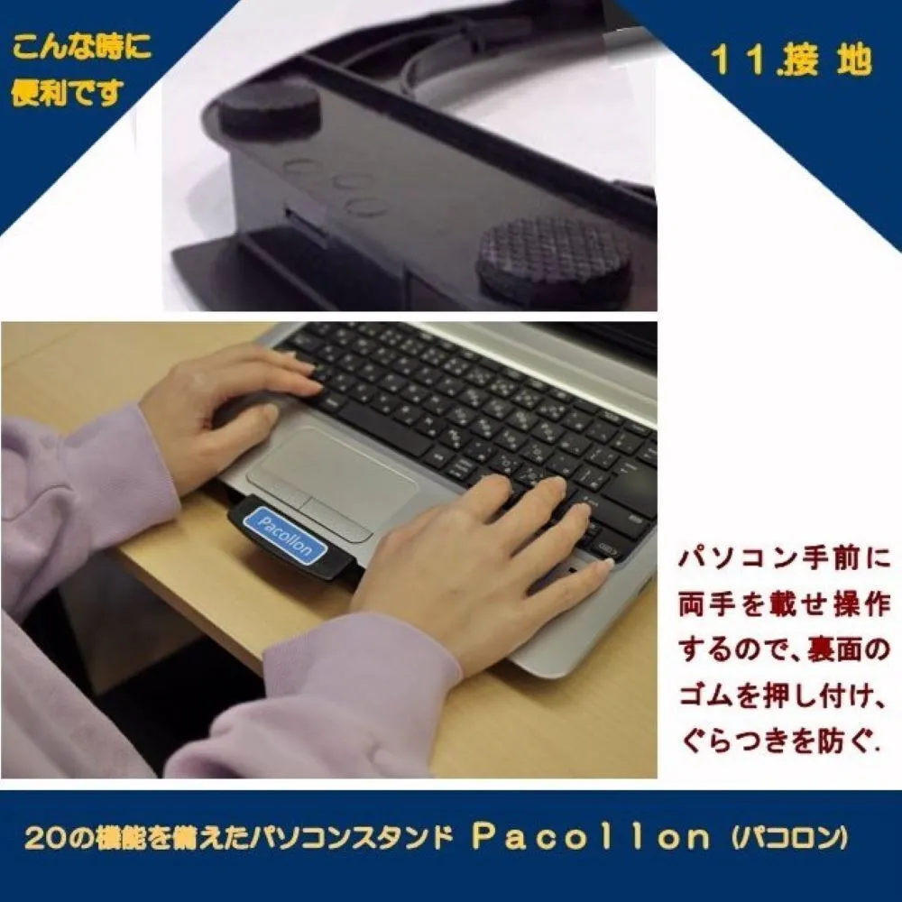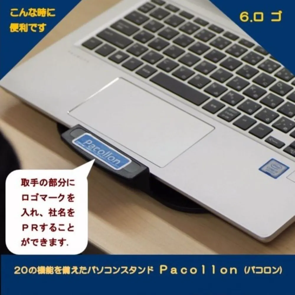 Pacollon(パコロン)は、2013年Windows8タッチパネル式ノートパソコンの操作性向上のため、東京秋葉原で販売を開始しました。手前の取っ手を指先で軽く浮かせるだけで、ノートパソコンを(スタンド下面2ヶ所に取り付けたボールベアリングにより)サッと手前に引き寄せることができ、タッチ操作が楽に行えます。2020年世界的なコロナ肺炎の流行に伴い、秋葉原でも閉店する店舗が相次ぎました。このため、販売形態を大手通販サイトへ移行いたしました。これに伴ない、生産工場を台湾から日本国内に変更し、“Pacollon” ブランドとして立ち上げました。2023年発売10周年を迎えたのを機に、全国の大手量販店の実店舗で、展示・販売を開始いたしました。