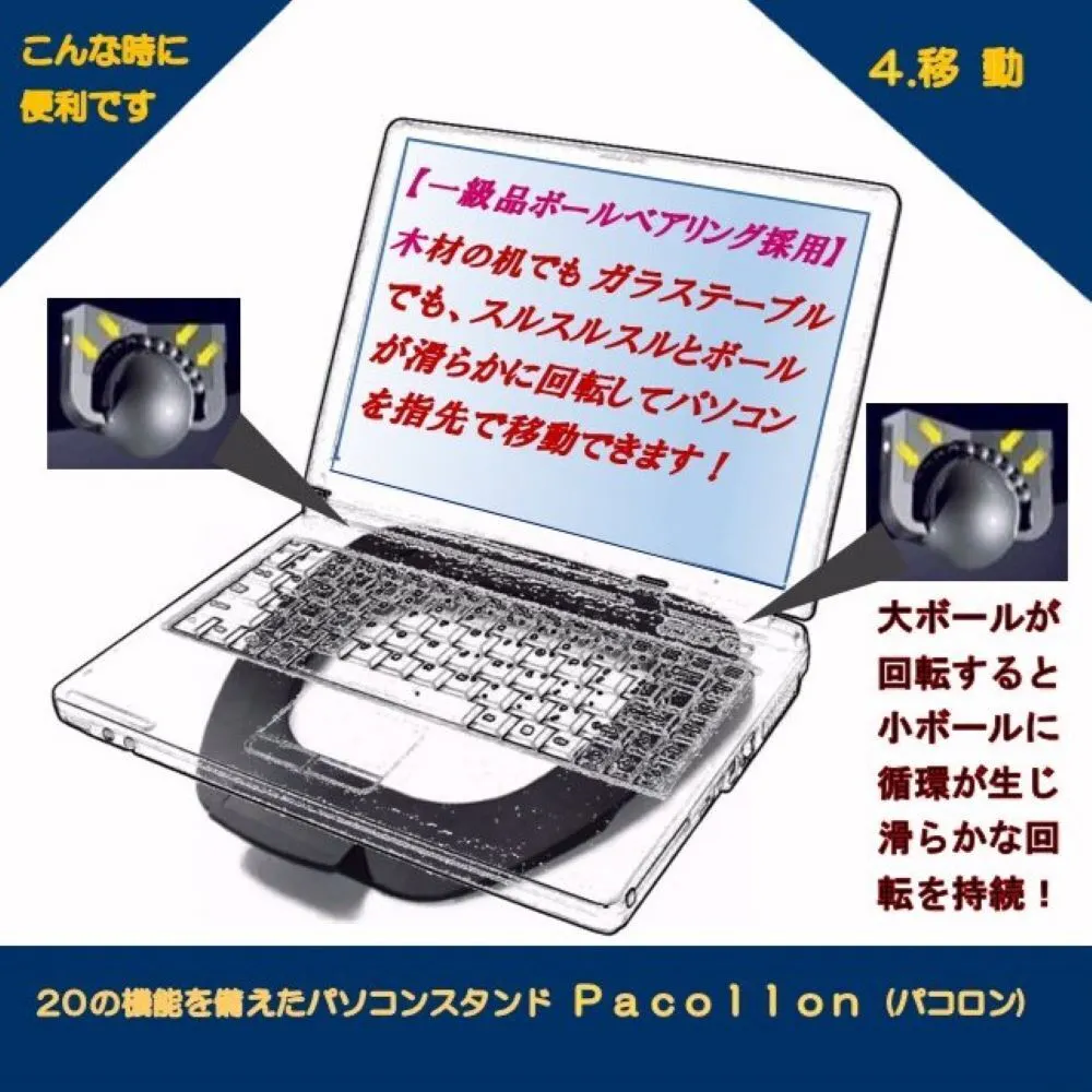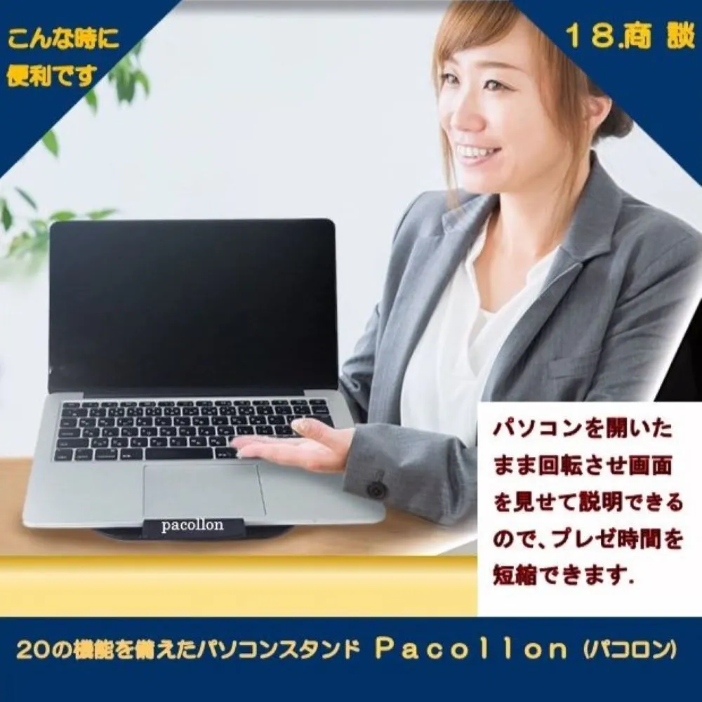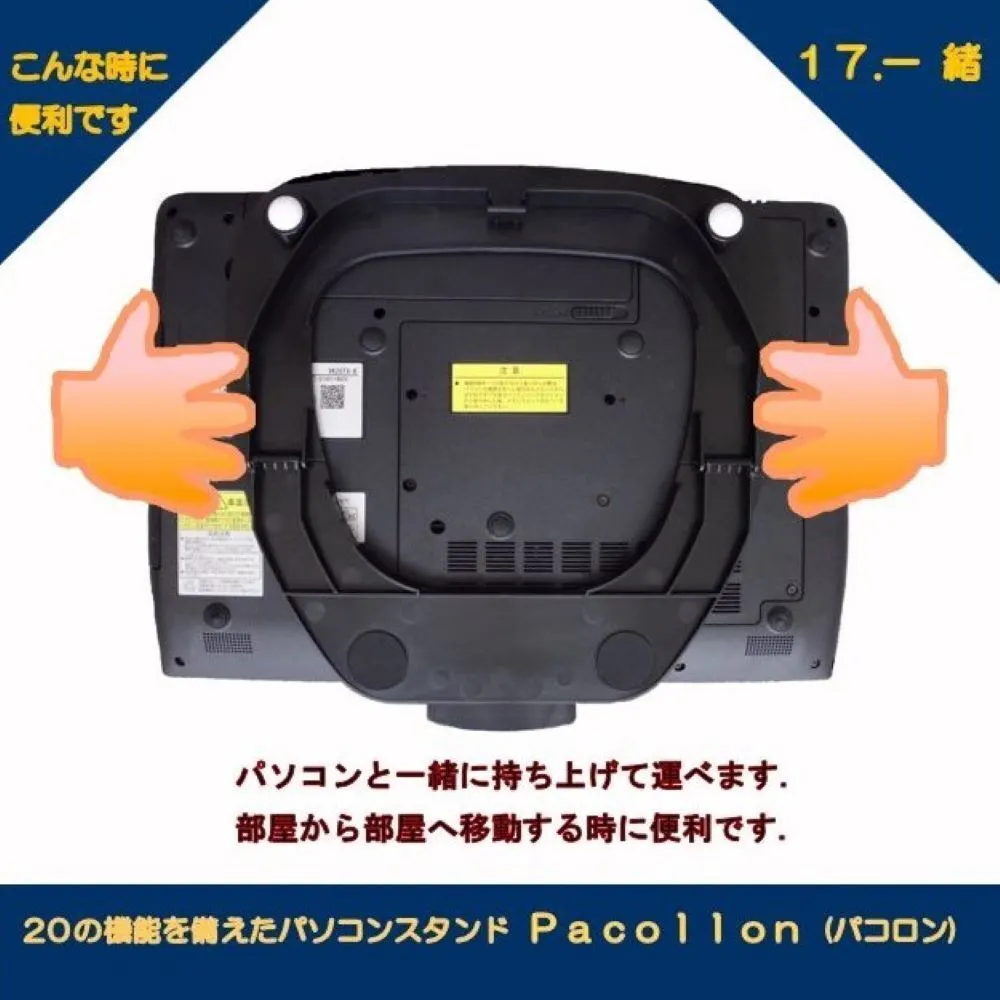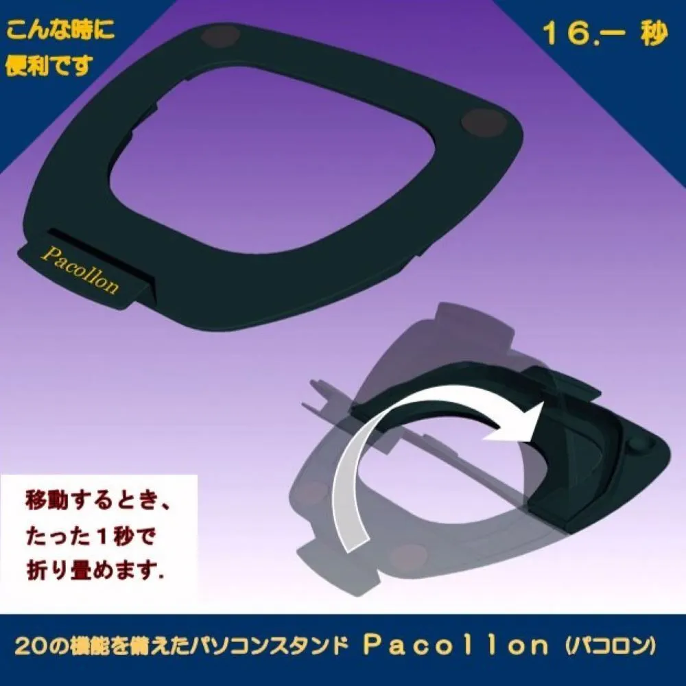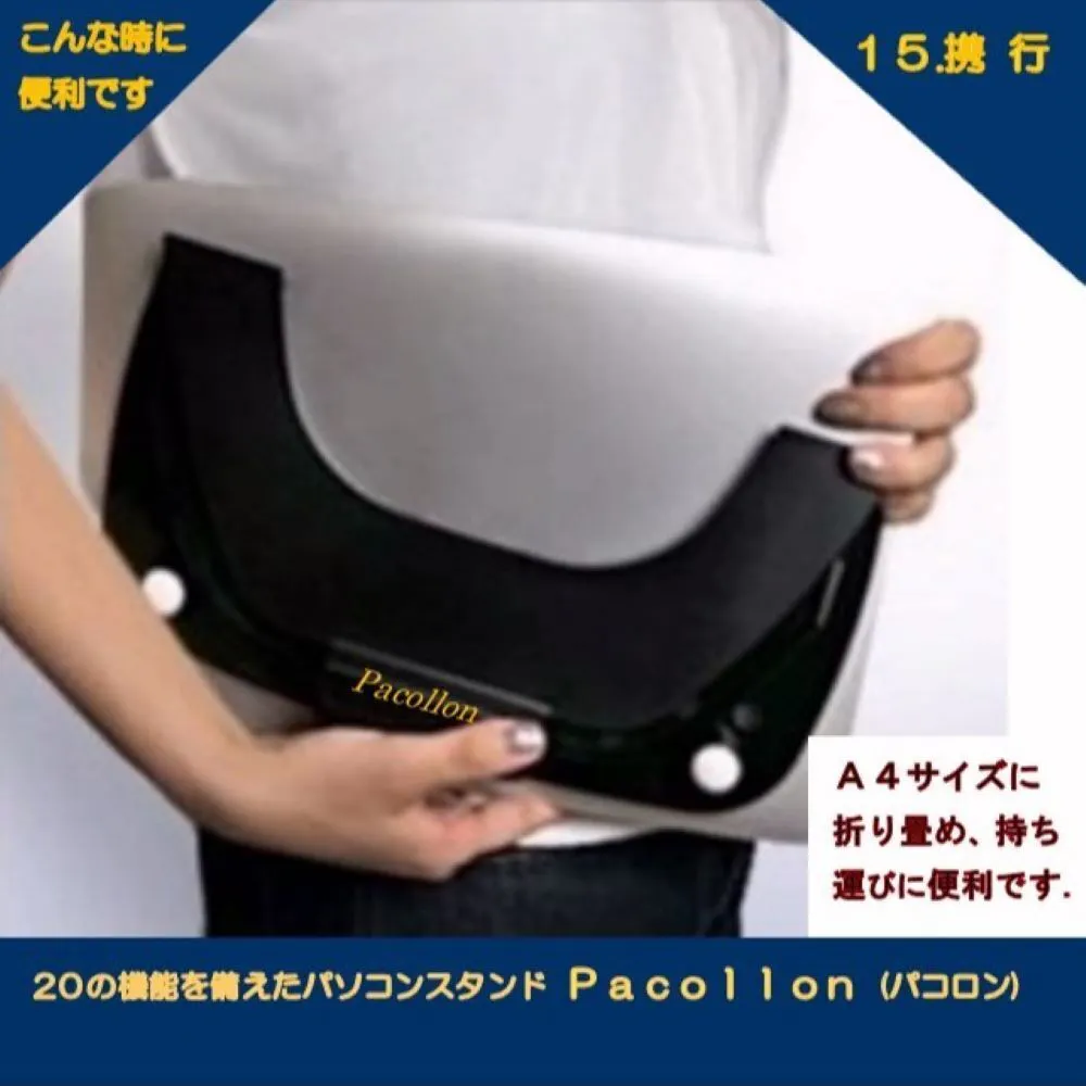 Pacollon(パコロン)は、2013年Windows8タッチパネル式ノートパソコンの操作性向上のため、東京秋葉原で販売を開始しました。手前の取っ手を指先で軽く浮かせるだけで、ノートパソコンを(スタンド下面2ヶ所に取り付けたボールベアリングにより)サッと手前に引き寄せることができ、タッチ操作が楽に行えます。2020年世界的なコロナ肺炎の流行に伴い、秋葉原でも閉店する店舗が相次ぎました。このため、販売形態を大手通販サイトへ移行いたしました。これに伴ない、生産工場を台湾から日本国内に変更し、“Pacollon” ブランドとして立ち上げました。2023年発売10周年を迎えたのを機に、全国の大手量販店の実店舗で、展示・販売を開始いたしました。
