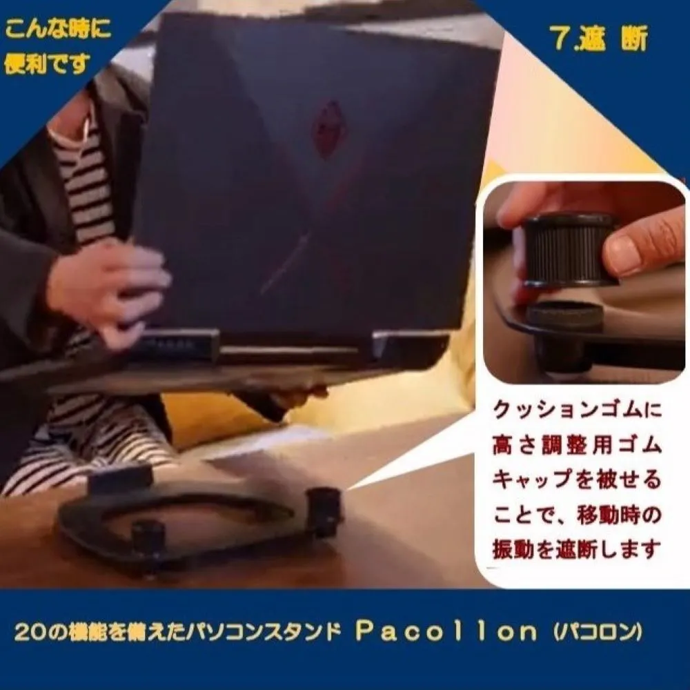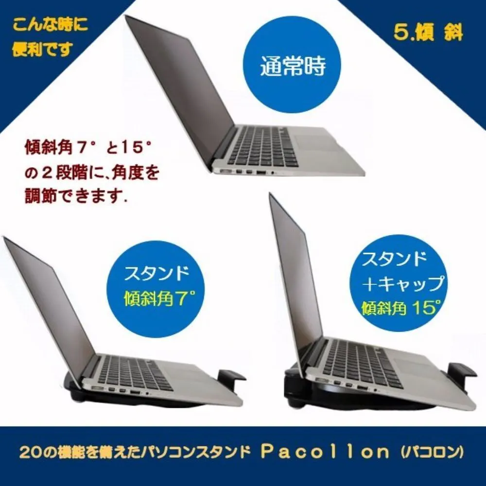 ノートパソコン移動スタンド Pacollon(パコロン) は180グラムとスマホ並みに軽く、2つ折りすればA4サイズにすっぽり収まるので、ノートパソコンと一緒に商談や会議の席に持ち運べます。パソコン画面をサッと回転させて相手に見せることができるので、会議や商談でのプレゼンの時間が短縮します。さらに、スタンド上面2ヶ所に取り付けられた滑り止め用クッションゴムに付属のゴムキャップを被せれば、キーボードが傾くことで、操作性が向上します。