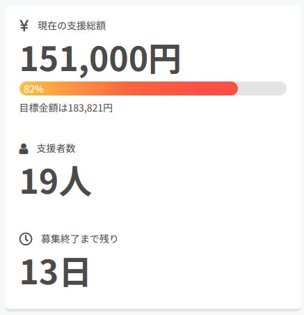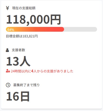 お世話になっております。 名無しの東北県人です。 前回の活動報告から現在までの間に、 新たに2名の方がご支援を行って下さいました。 現在の調達率は82%、パトロン様は19名となっております。 本当にありがとうございます。 引き続き、何卒宜しくお願い致します。