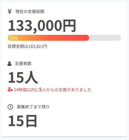 お世話になっております。 名無しの東北県人です。 前回の活動報告から現在までの間に、 新たに1名の方がご支援を行って下さいました。 現在の調達率は72%、パトロン様は15名となっております。 本当にありがとうございます。 引き続き、何卒宜しくお願い致します。