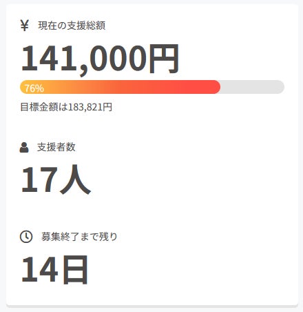 お世話になっております。 名無しの東北県人です。 前回の活動報告から現在までの間に、 新たに2名の方がご支援を行って下さいました。 現在の調達率は76%、パトロン様は17名となっております。 本当にありがとうございます。 引き続き、何卒宜しくお願い致します。