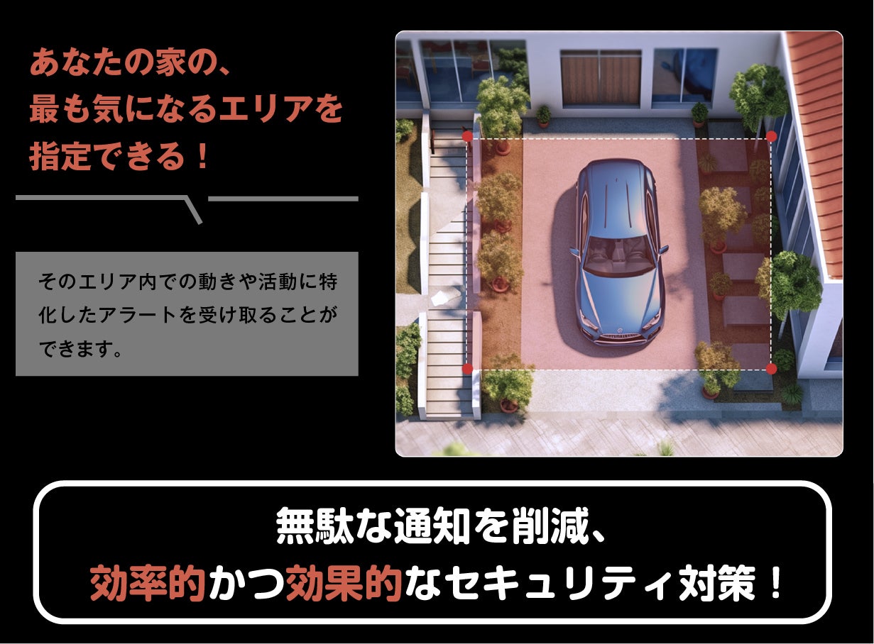 設定されたエリア内を集中的に監視します。通知も設定されたエリア内に特化して受け取ることができるので、不要な通知を減らし効率的で効果的なセキュリティ対策が可能になります。