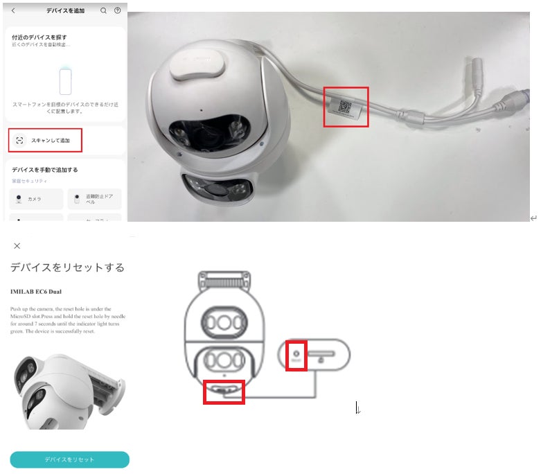 2024/07/11 09:22いつも【EC6 DualCamプロジェクト】を応援いただきありがとうございます。アプリとデバイス(EC6 DualCam)の接続方法をご案内いたします。(1)アプリとデバイスの接続方法アプリ内【デバイスを追加する】をクリックしていただきますと、以下3つの接続方法が表示されます。➀付近のデバイスを探す(自動検索)②スキャンして追加(QRコードをスキャン)③デバイスを手動で追加する(デバイス選択後、QRコードスキャン)こちらは、②の「スキャンして追加」を選択していただき、QRコードをスキャンしてください。スキャンに必要なQRコードは、壁掛けブラケットに繋がっているケーブルに貼り付けてありますので、スキャンしてください。剥がして捨てないようにご注意ください。(2)デバイスのリセット方法デバイスを追加すると、デバイスのリセット画面に遷移いたします。音声アナウンスに合わせ、この画面のみ英文となっておりますので、こちらに日本語訳を掲載させていただきます。【日本語訳】カメラを押し上げると、リセットホールはMicroSDスロットの下にあります。インジケータライトが緑色に点灯するまで、リセットホールを針で約7秒間押し続けます。デバイスは正常にリセットされます。デバイスのリセットが完了しますと、Wi-Fi接続画面に遷移いたします。その後は、日本語の案内にしたがって、設定を完了してください。設定方法にご不明な点がありましたら、カスタマーサポートまでお気軽にメッセージでお問合せください。引き続き【EC6 DualCamプロジェクト】を、どうぞよろしくお願い致します! もっと見る