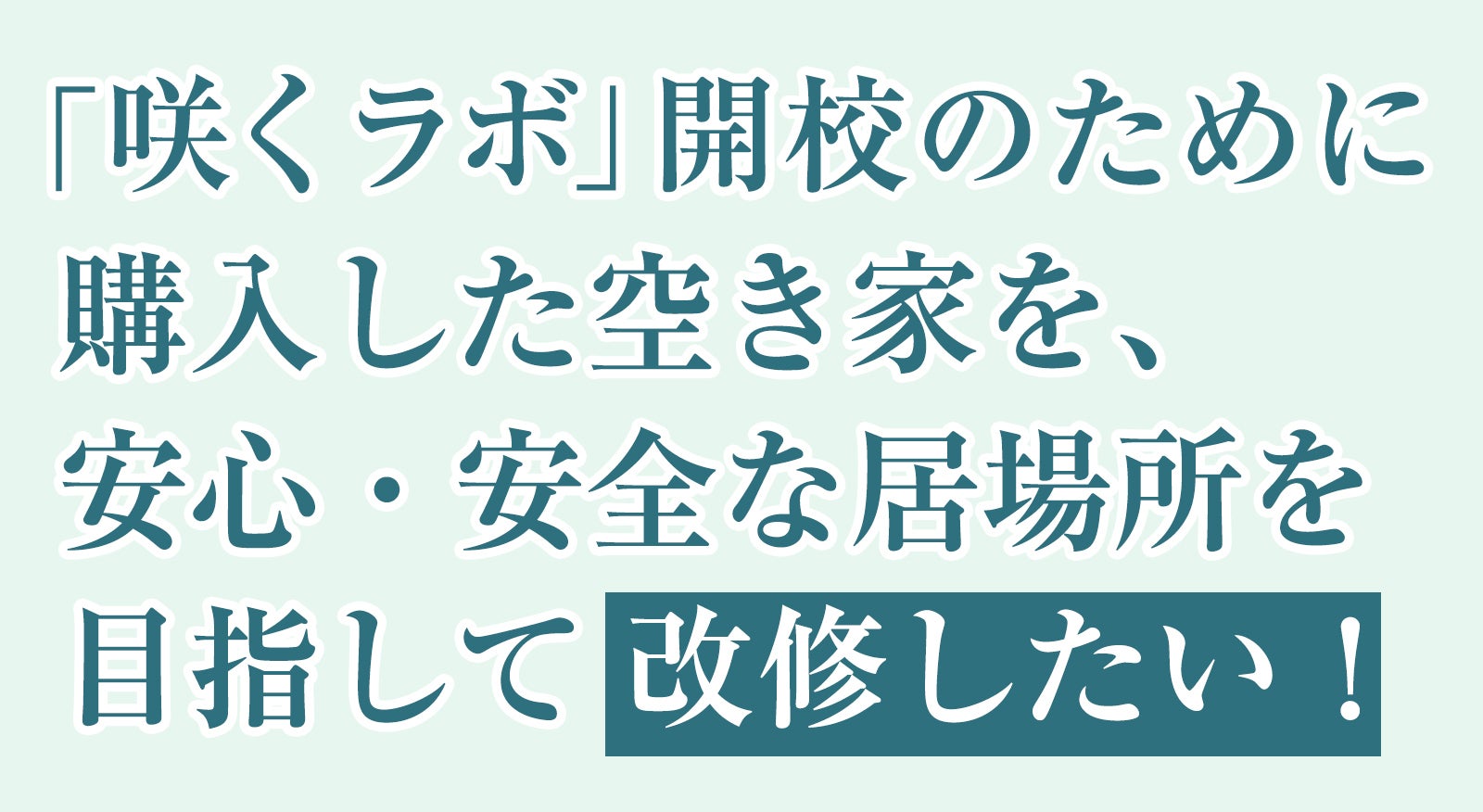 異学年や地域と関わり合いを持てるような「安心の場」を、新しい「学校」として開校するには物件が必要です。