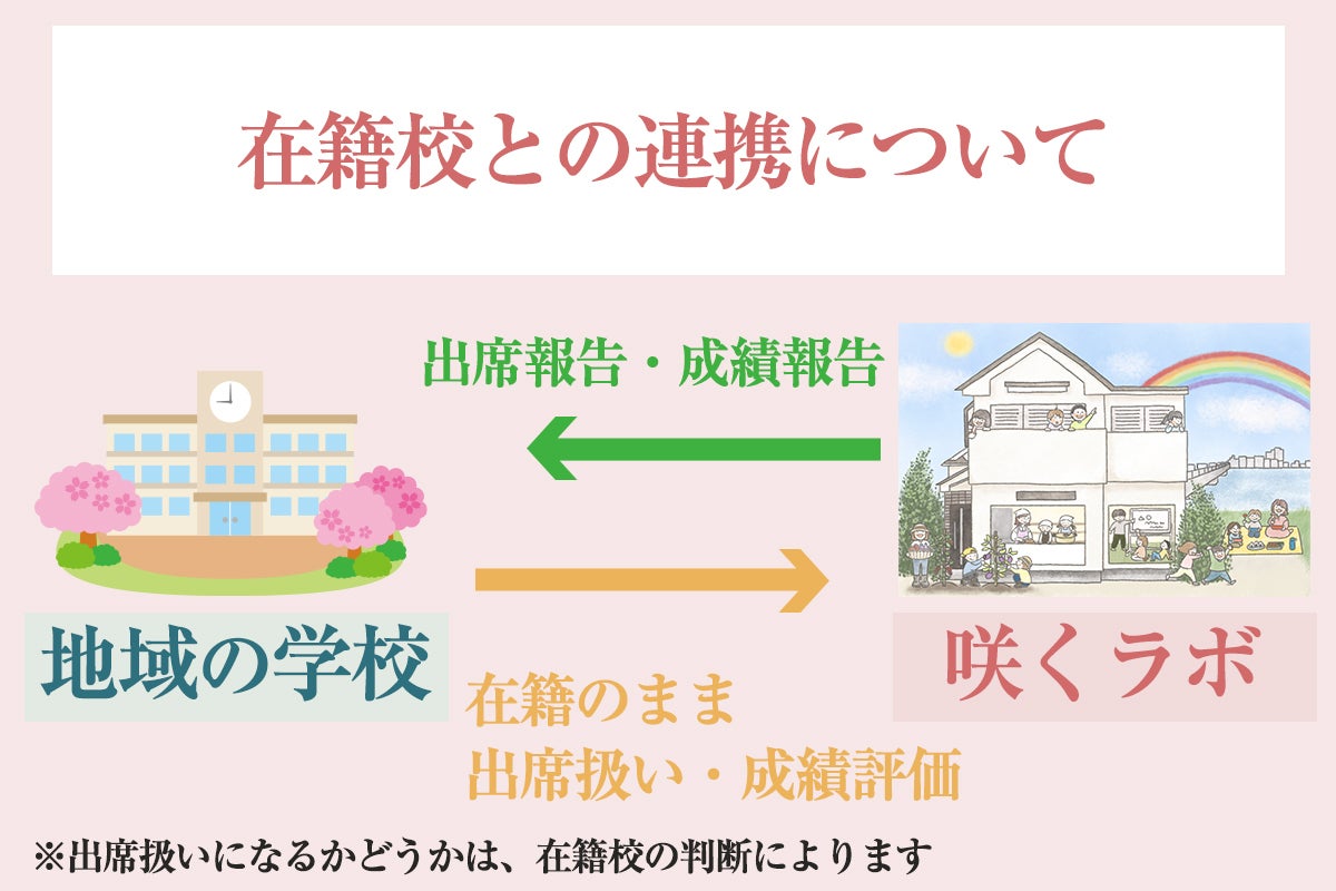 A. 出席認定については、在籍校によって扱いが異なってきます。咲くラボでは、在籍校と連携をとらせていただき、出席扱いになるように働きかけをしていきます。