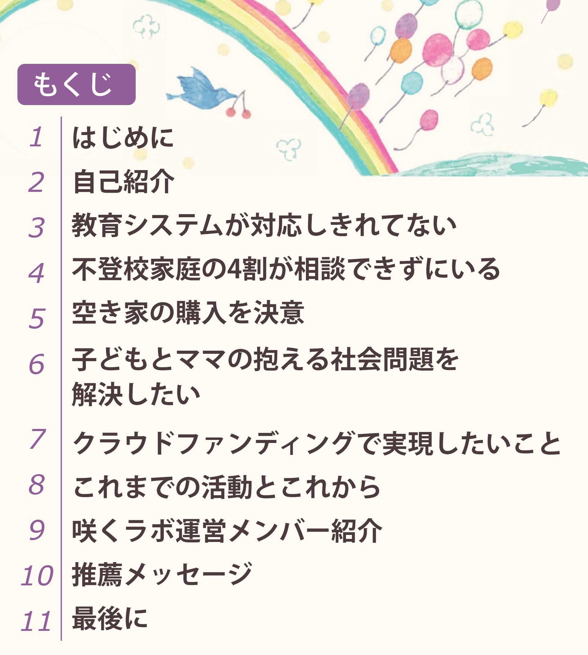 ※このクラウドファンディングは万智さくらによるプロジェクトです。ページ内でご紹介している法人、個人様は本プロジェクトとは関係はありません。お問い合わせは万智さくら までお願いします。掲載している写真については掲載の許可をいただいております。※掲載している内容は2024年7月時点での情報になります。カリキュラムや運営メンバーなどは本開校時に変更になっている場合がございます。予めご了承ください。
