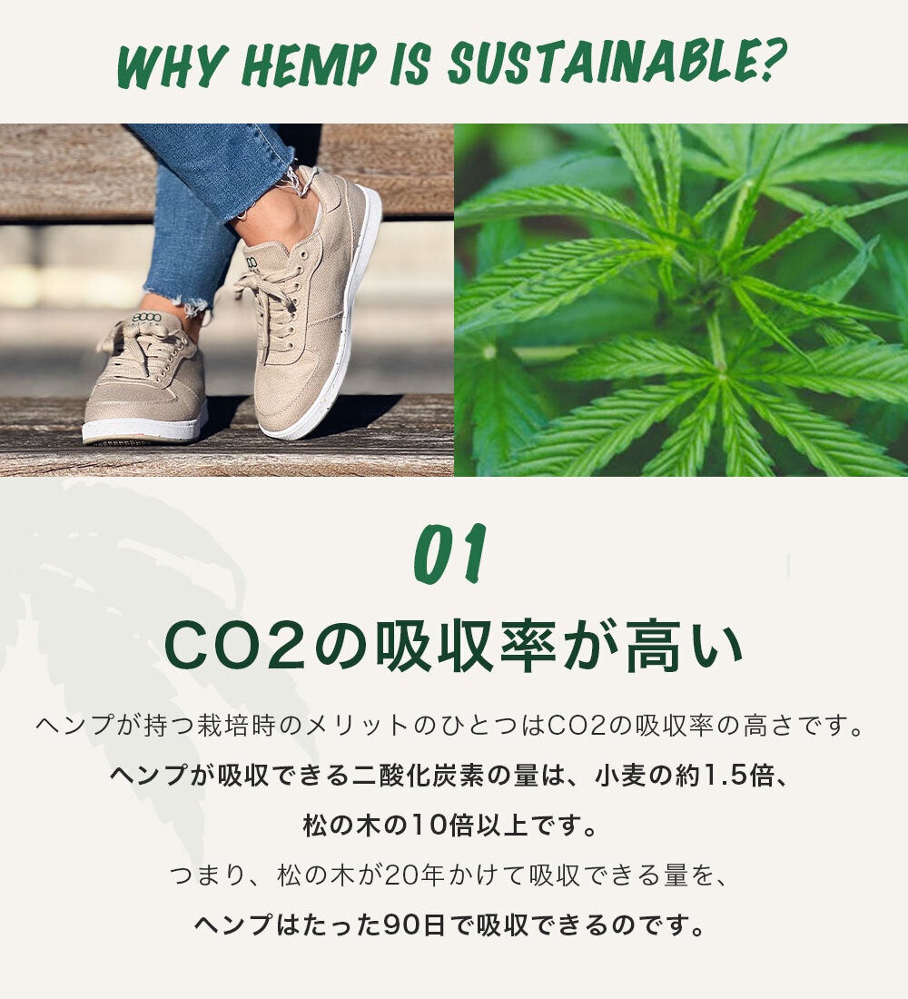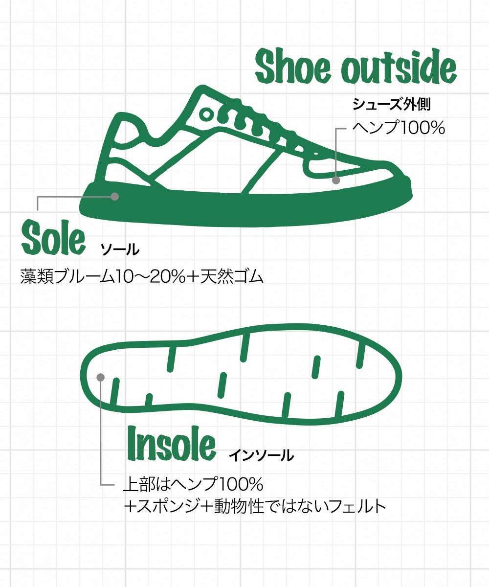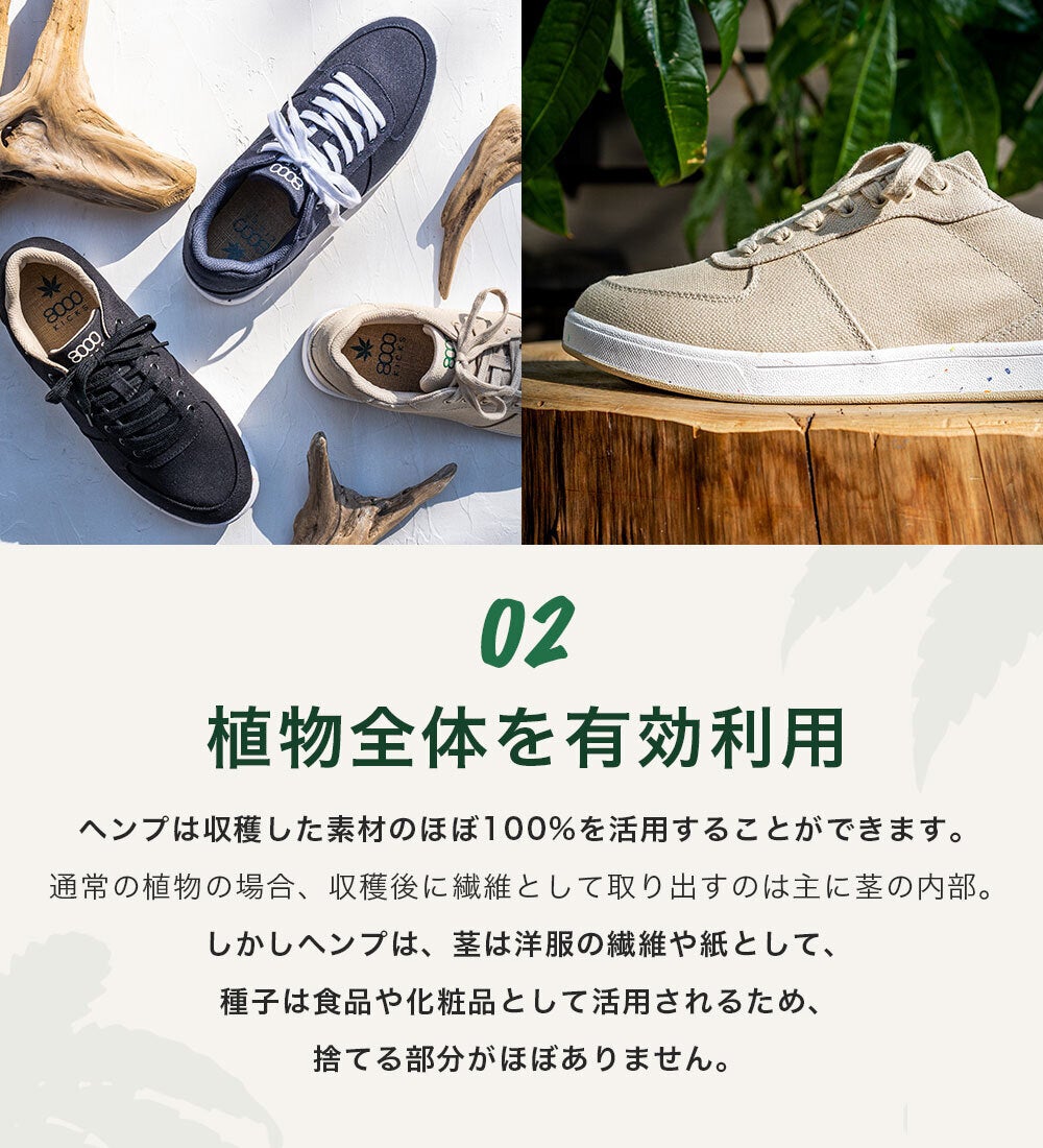 また、世界初のヘンプ素材インソールも使用。天然の抗菌性があり、足の臭いや菌の繁殖を抑えます。