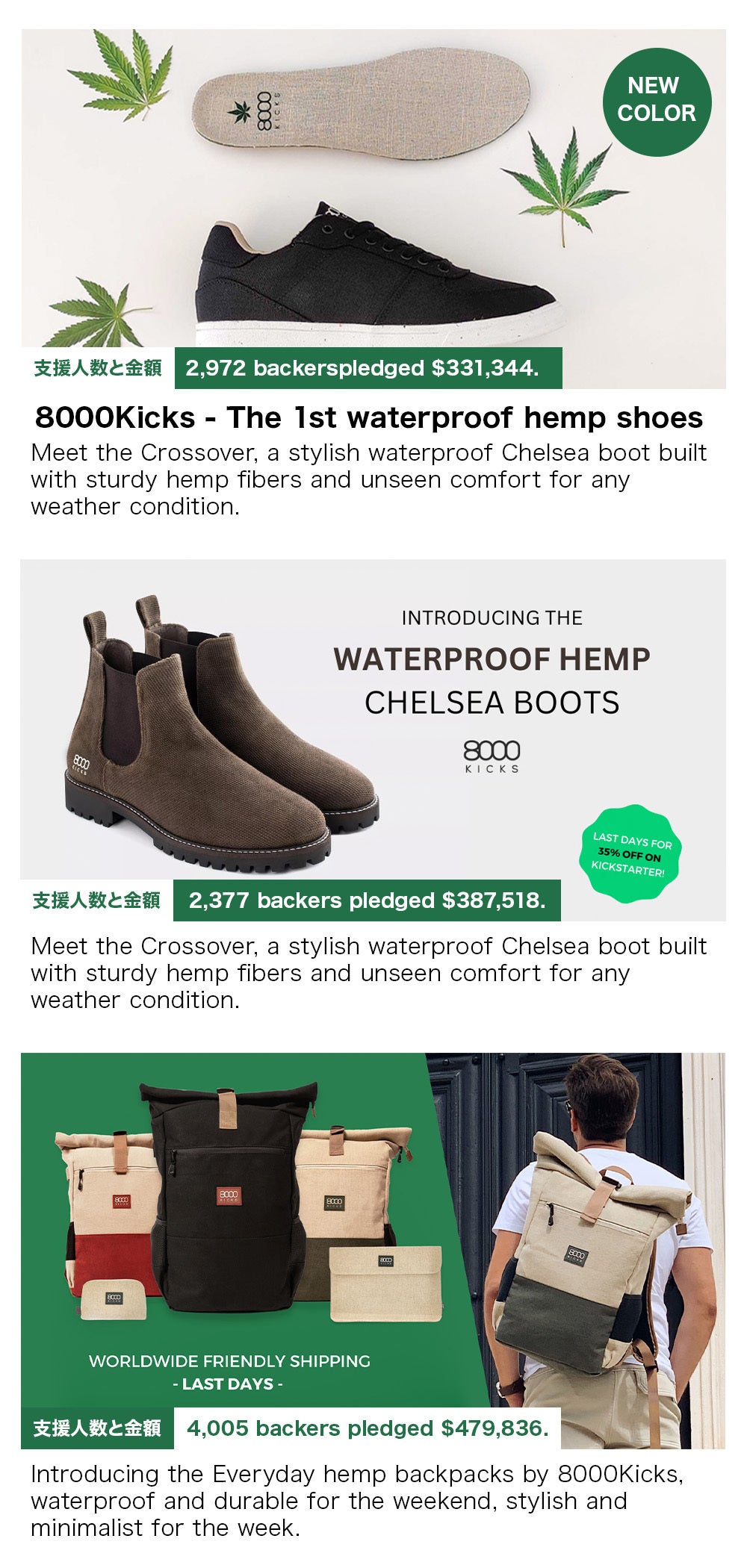 2024/10/11 18:00支援者の皆様すっかり秋らしくなり、少し肌寒い日がございますが、皆さまはいかがお過ごしですか?この度、8000kicksの新商品「NOMADバックパック」のキャンペーンが開催いたしました!ビジネスやアウトドアなど、様々なシーンで活躍できるエシカル素材から生まれたバックパックです。現在開催されている海外のクラウドファンディングでも、圧倒的な支持を受けている、8000kicks「NOMADバックパック」が、この度日本初上陸です!初日限定割引や、最大30%OFFのリターンもございます。現在、たくさんのご支援をいただいており大盛況となっております!ぜひ新しいキャンペーンもご支援いただけますと大変励みになります!キャンペーンの方は、11月30日まで開催予定となっております。短い期間ではございますが、精一杯頑張って参りますので、何卒よろしくお願い致します! もっと見る