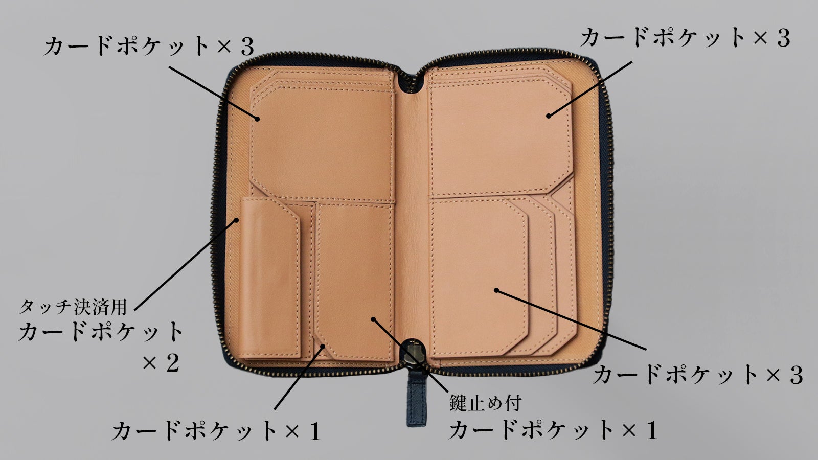 パーテーション裏の2つのカードポケットのみ、タッチ決済対応のため、セキュリティガードを外してあります。