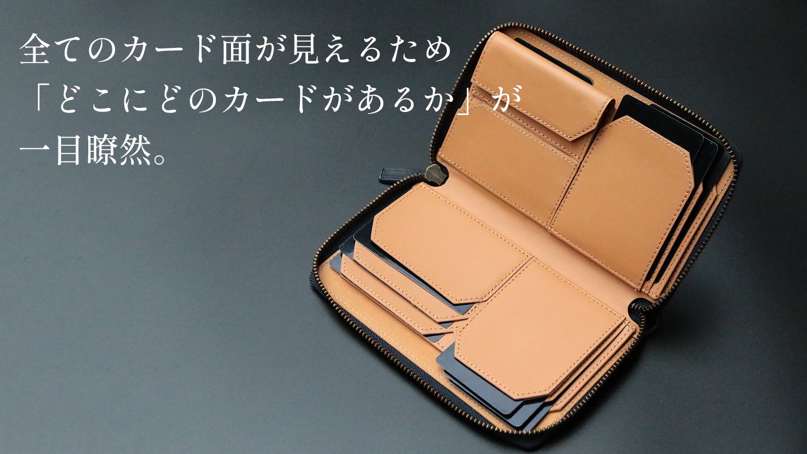 カードポケットに入れると自然とカードが少しずつずれ、全てのカードの面が見える設計。