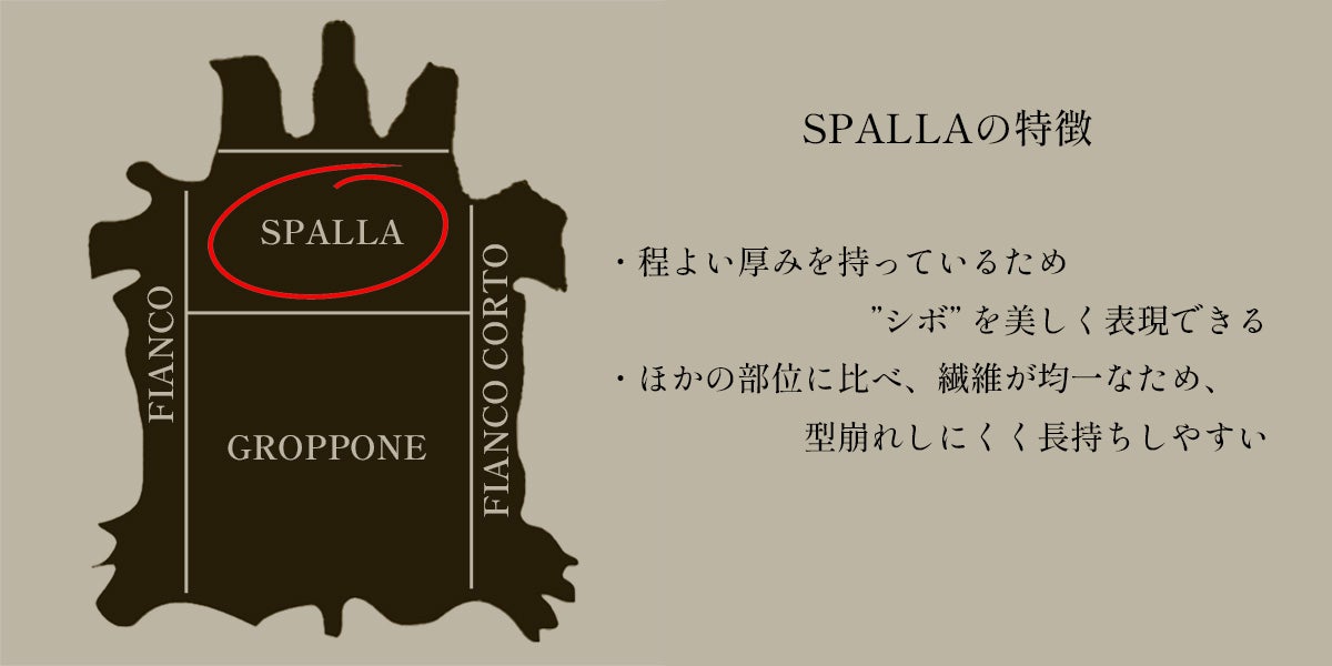 ②一枚の革の中でも特に程よい厚みを持ち、繊維が均一で美しい【SPALLA】と呼ばれる肩(ショルダー)の部位のみ を贅沢に使用しました。